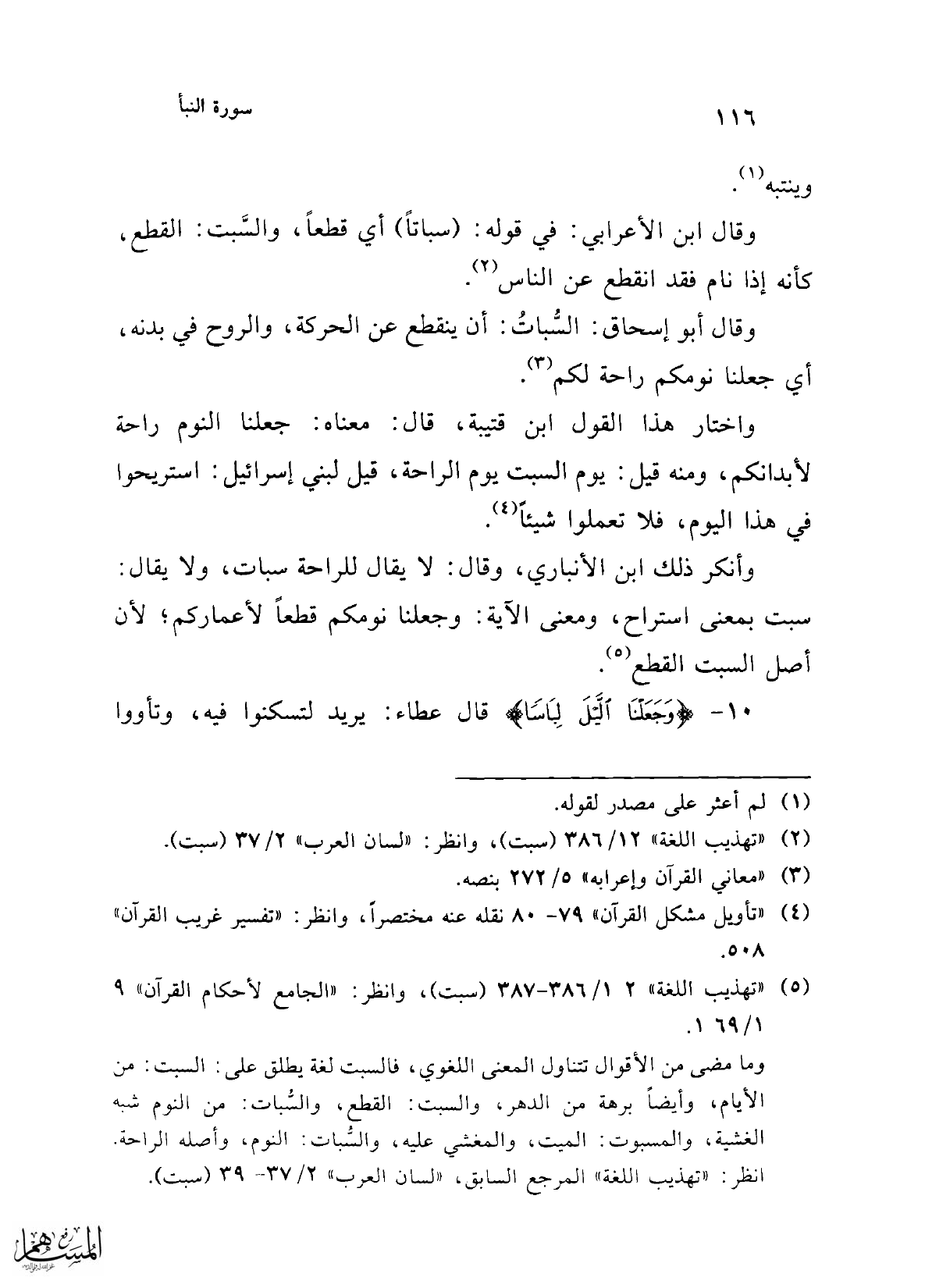 (¬5) "تهذيب اللغة" 12/ 386 - 387 (سبت)، وانظر: "الجامع لأحكام القرآن" 19/ 169.