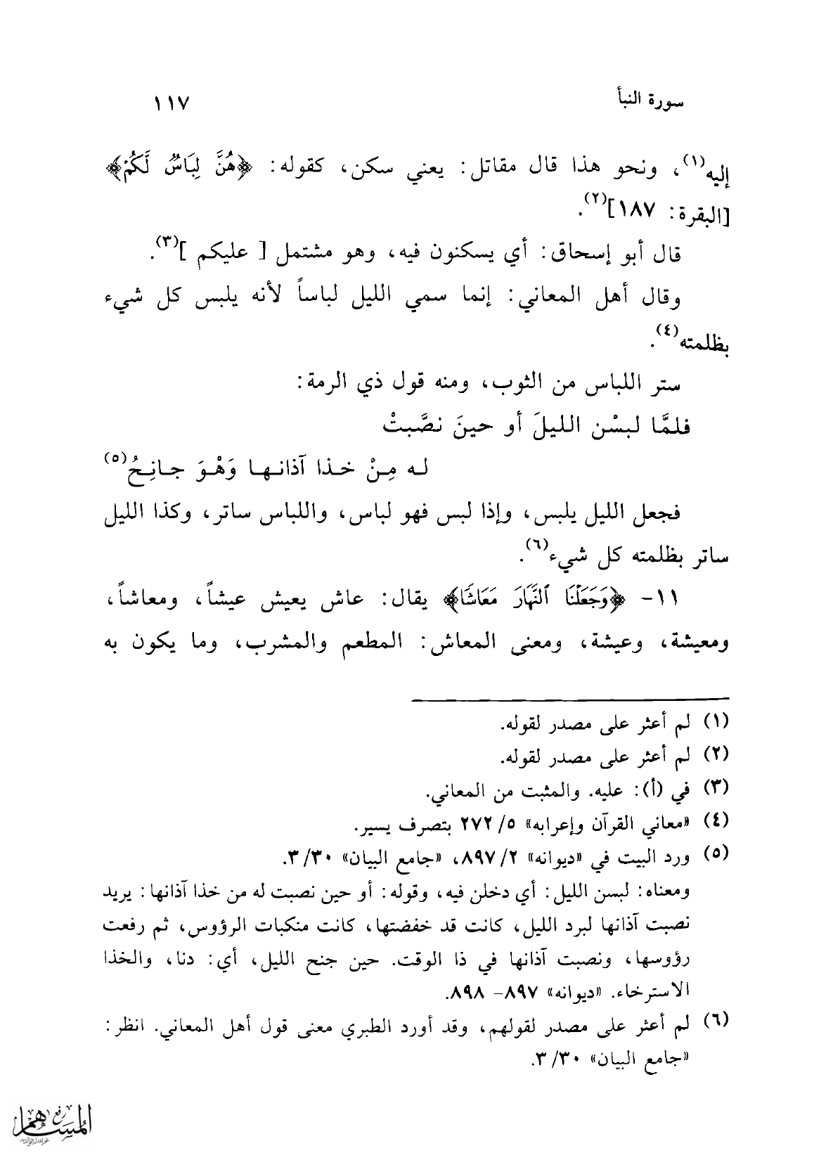(¬6) لم أعثر على مصدر لقولهم، وقد أورد الطبري معنى قول أهل المعاني. انظر: "جامع البيان" 30/ 3.
