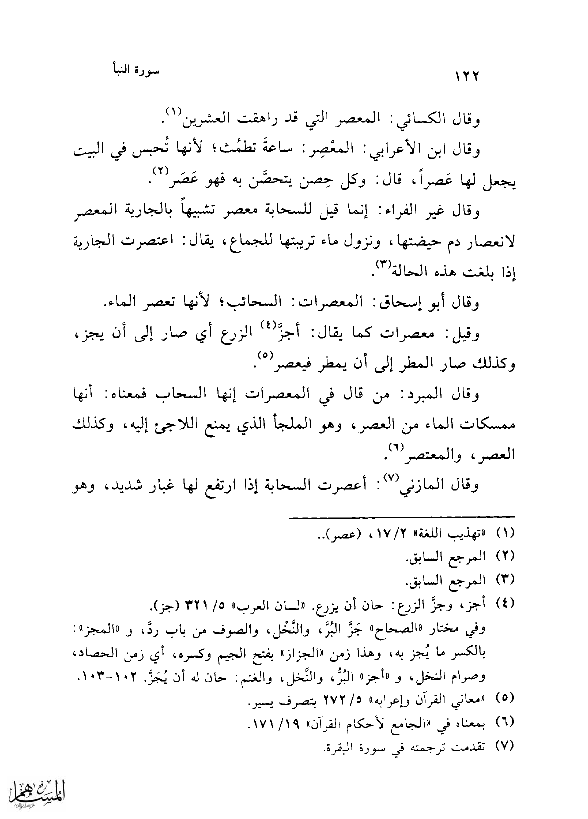 وقال المبرد: من قال في المعصرات إنها السحاب فمعناه: أنها ممسكات الماء من العصر، وهو الملجأ الذي يمنع اللاجئ إليه، وكذلك العصر، والمعتصر (¬6).