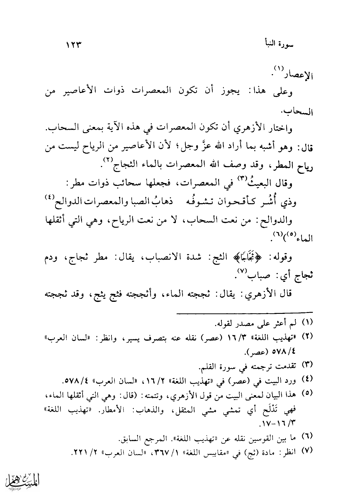 واختار الأزهري أن تكون المعصرات في هذه الآية بمعنى السحاب. قال: وهو أشبه بما أراد الله عَزَّ وَجَلَّ؛ لأن الأعاصير من الرياح ليست من رياح المطر، وقد وصف الله المعصرات بالماء الثجاج (¬2).