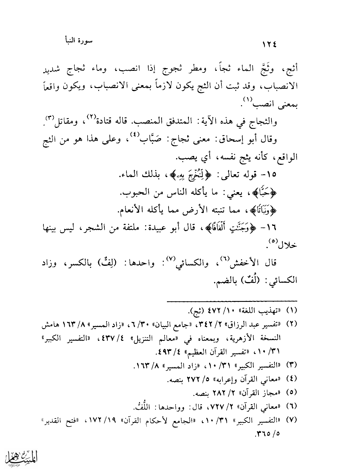 16 - {وَجَنَّاتٍ أَلْفَافًا}، قال أبو عبيدة: ملتفة من الشجر، ليس بينها خلال (¬5).