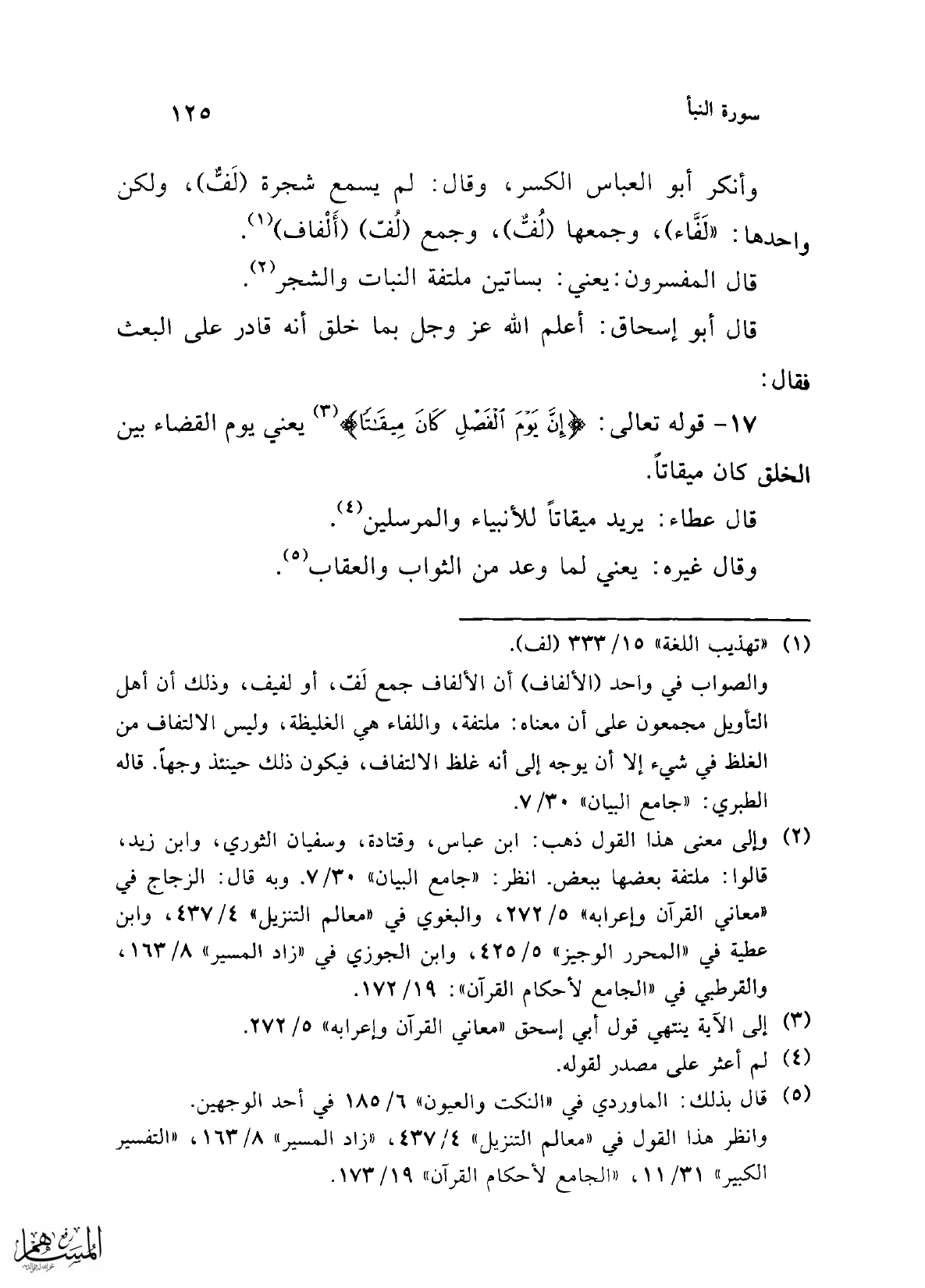 17 - قوله تعالى: {إِنَّ يَوْمَ الْفَصْلِ كَانَ مِيقَاتًا} (¬3) يعني يوم القضاء بين الخلق كان ميقاتاً.