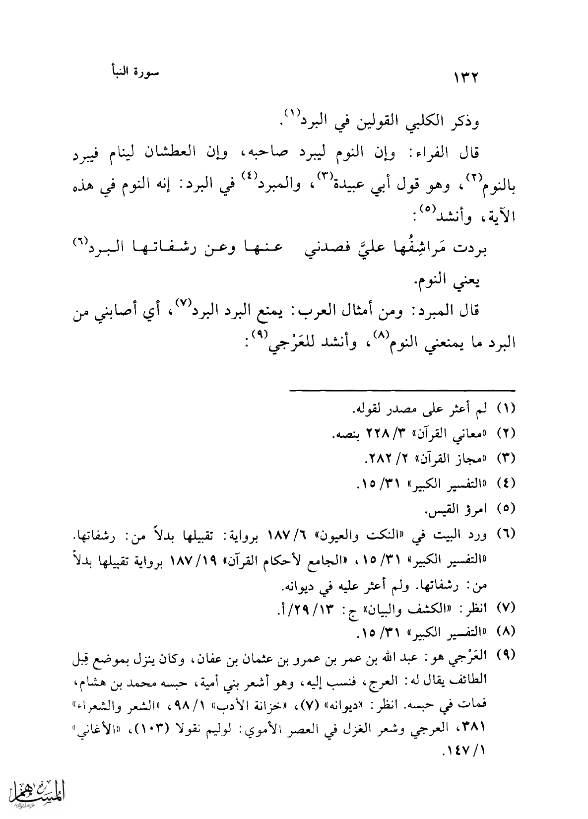 قال الفراء: وإن النوم ليبرد صاحبه، وإن العطشان لينام فيبرد بالنوم (¬2)، وهو قول أبي عبيدة (¬3)، والمبرد (¬4) في البرد: إنه النوم في هذه الآية، وأنشد (¬5):