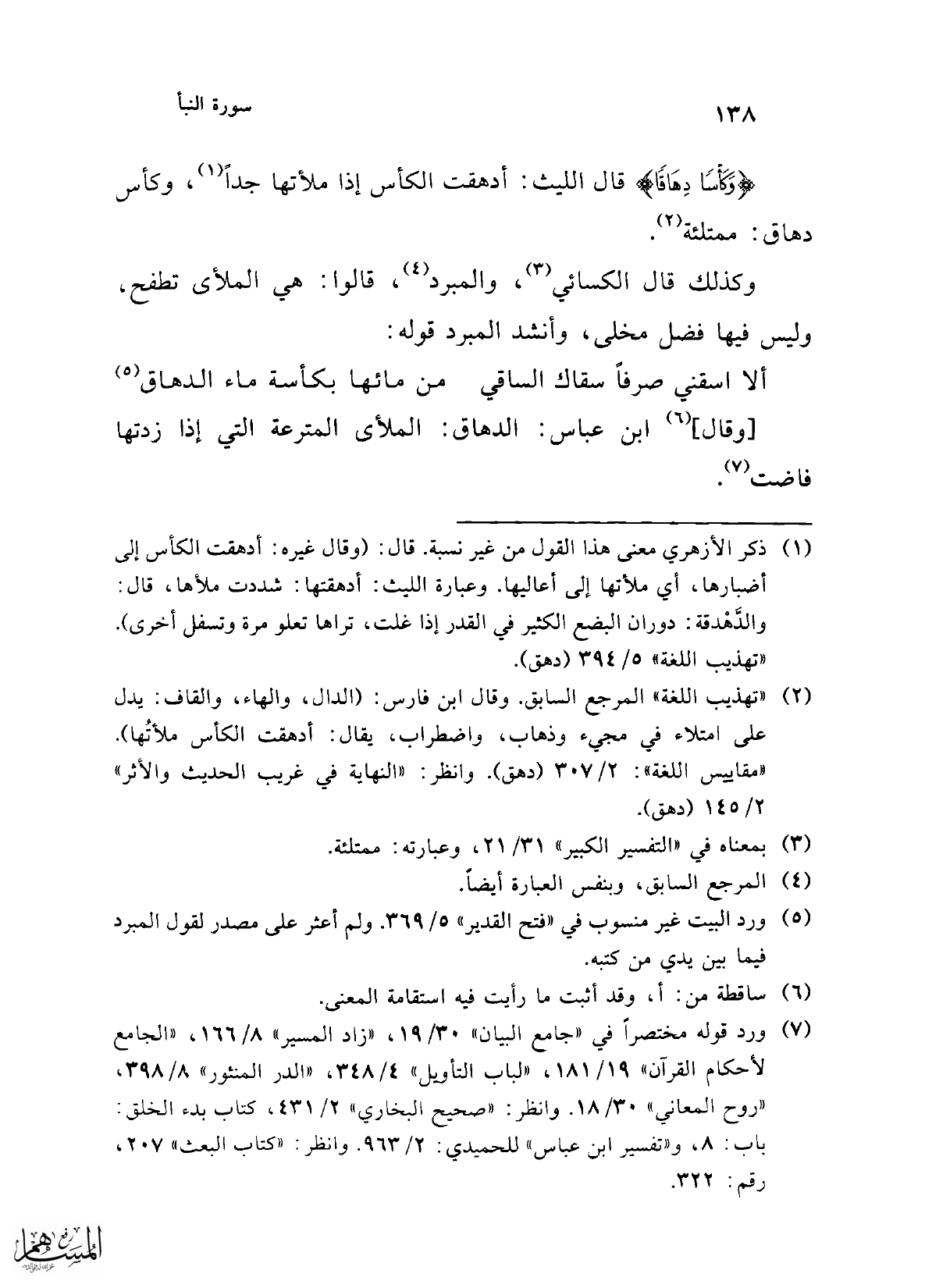 {وَكَأْسًا دِهَاقًا} قال الليث: أدهقت الكأس إذا ملأتها جداً (¬1)، وكأس دهاق: ممتلئة (¬2).