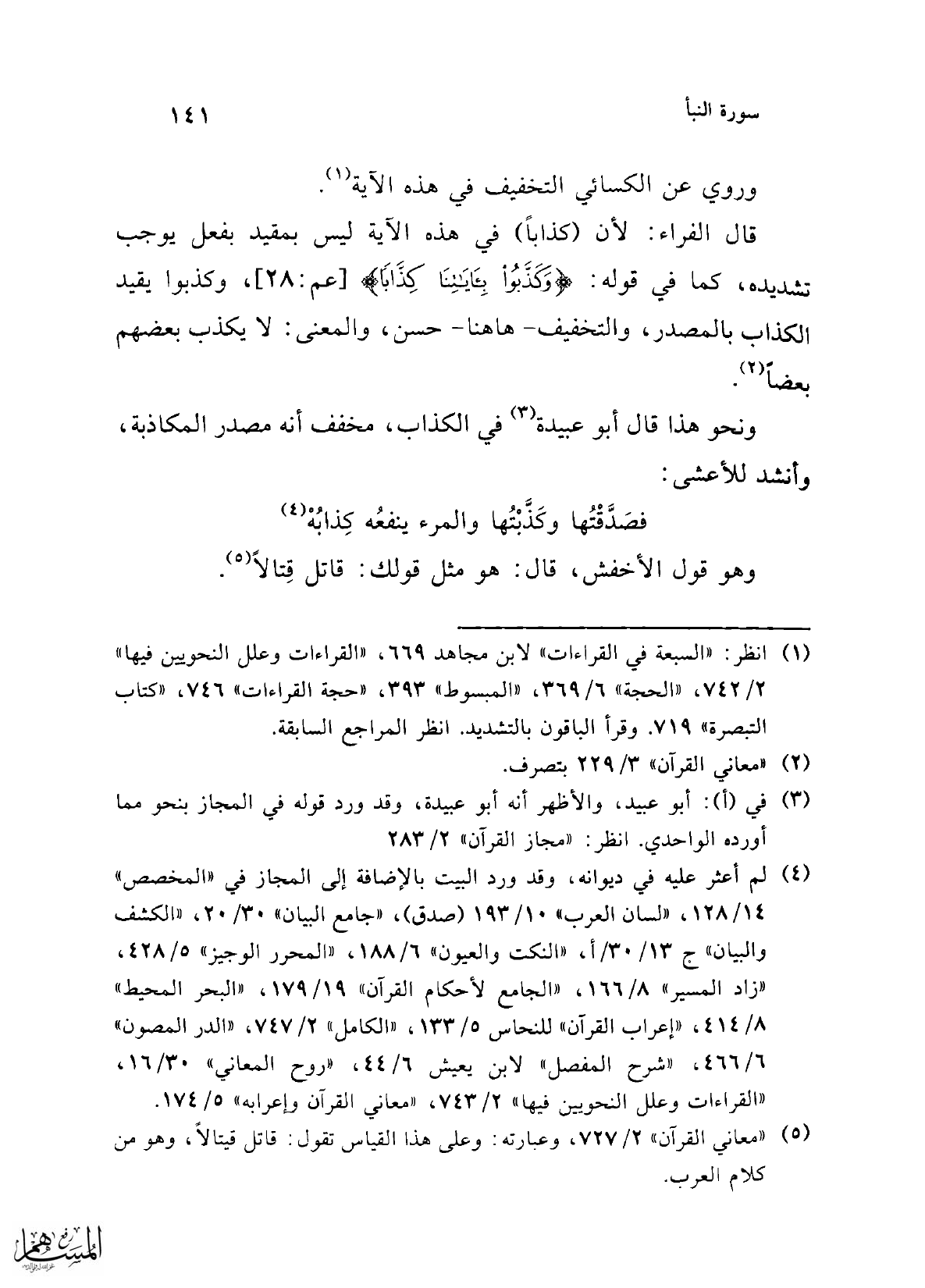 قال الفراء: لأن (كذاباً) في هذه الآية ليس بمقيد بفعل يوجب تشديده، كما في قوله: {وَكَذَّبُوا بِآيَاتِنَا كِذَّابًا} [النبأ: 28]، وكذبوا يقيد الكذاب بالمصدر، والتخفيف -هاهنا- حسن، والمعنى: لا يكذب بعضهم بعضاً (¬2).