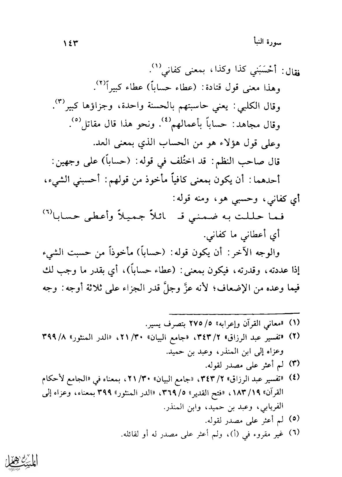 والوجه الآخر: أن يكون قوله: (حساباً) مأخوذاً من حسبت الشيء إذا عددته، وقدرته، فيكون بمعنى: (عطاء حساباً)، أي بقدر ما وجب لك فيما وعده من الإضعاف؛ لأنه عز وجلَّ قدر الجزاء على ثلاثة أوجه: وجه