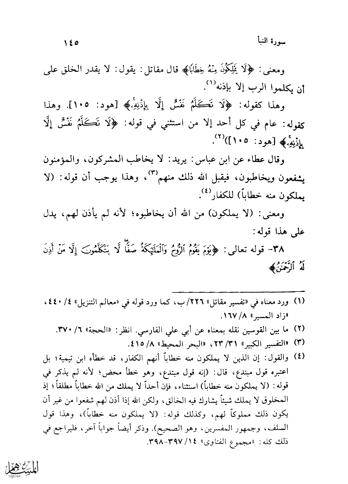 (¬4) والقول: إن الذين لا يملكون منه خطاباً أنهم الكفار، قد خطأه ابن تيمية؛ بل اعتبره قول مبتدع، قال: (إنه قول مبتدع، وهو خطأ محض؛ لأنه لم يذكر في قوله: (لا يملكون منه خطاباً) استثناء، فإن أحداً لا يملك من الله خطاباً مطلقاً؛ إذ المخلوق لا يملك شيئاً يشارك فيه الخالق، ولكن الله إذا أذن لهم شفعوا من غير أن يكون ذلك مملوكاً لهم، وكذلك قوله: (لا يملكون منه خطاباً)، وهذا قول السلف، وجمهور المفسرين، وهو الصحيح). وذكر أيضًا جواباً آخر، فليراجع في ذلك كله: "مجموع الفتاوى" 14/ 397 - 398.