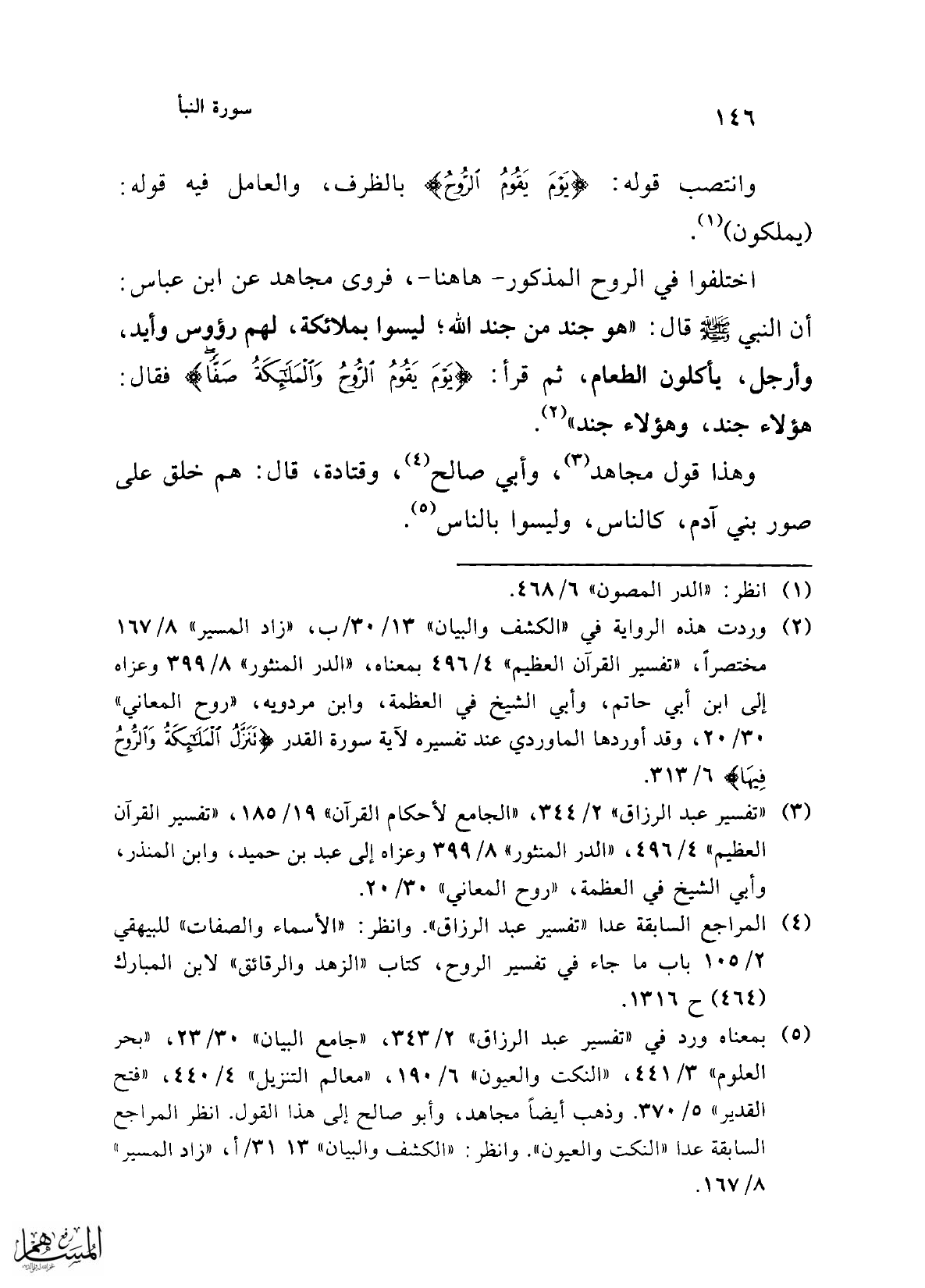 اختلفوا في الروح المذكور -هاهنا-، فروى مجاهد عن ابن عباس: أن النبي -صلى الله عليه وسلم- قال: "هو جند من جند الله؛ ليسوا بملائكة، لهم رؤوس وأيد، وأرجل، يأكلون الطعام، ثم قرأ: {يَوْمَ يَقُومُ الرُّوحُ وَالْمَلَائِكَةُ صَفًّا} فقال: هؤلاء جند، وهؤلاء جند" (¬2).