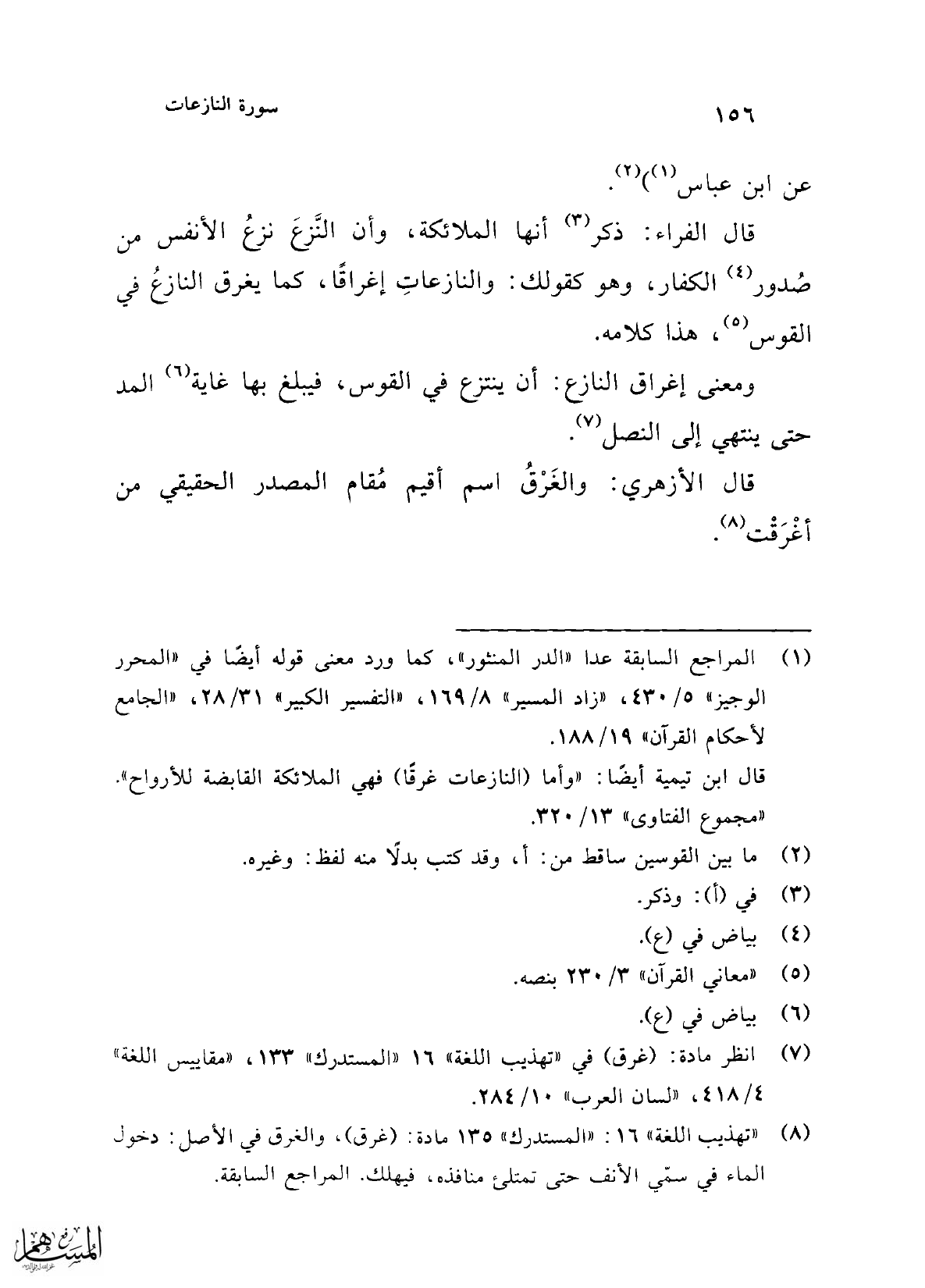 قال ابن تيمية أيضًا: "وأما (النازعات غرقًا) فهي الملائكة القابضة للأرواح". "مجموع الفتاوى" 13/ 320.