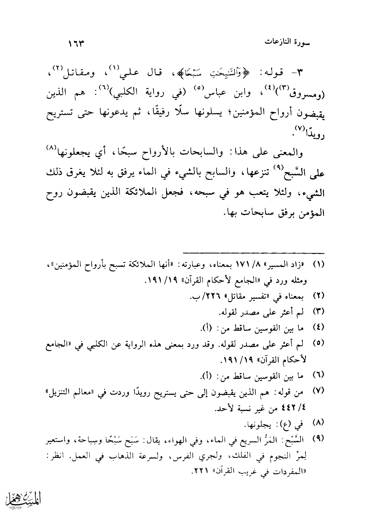 (¬1) "زاد المسير" 8/ 171 بمعناه، وعبارته: "أنها الملائكة تسبح بأرواح المؤمنين"، ومثله ورد في "الجامع لأحكام القرآن" 19/ 191.