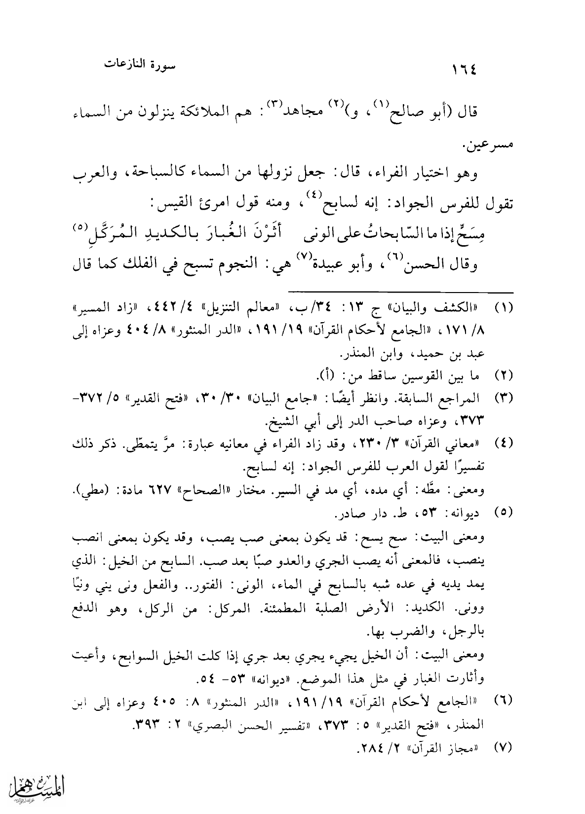 وهو اختيار الفراء، قال: جعل نزولها من السماء كالسباحة، والعرب تقول للفرس الجواد: إنه لسابح (¬4)، ومنه قول امرئ القيس: