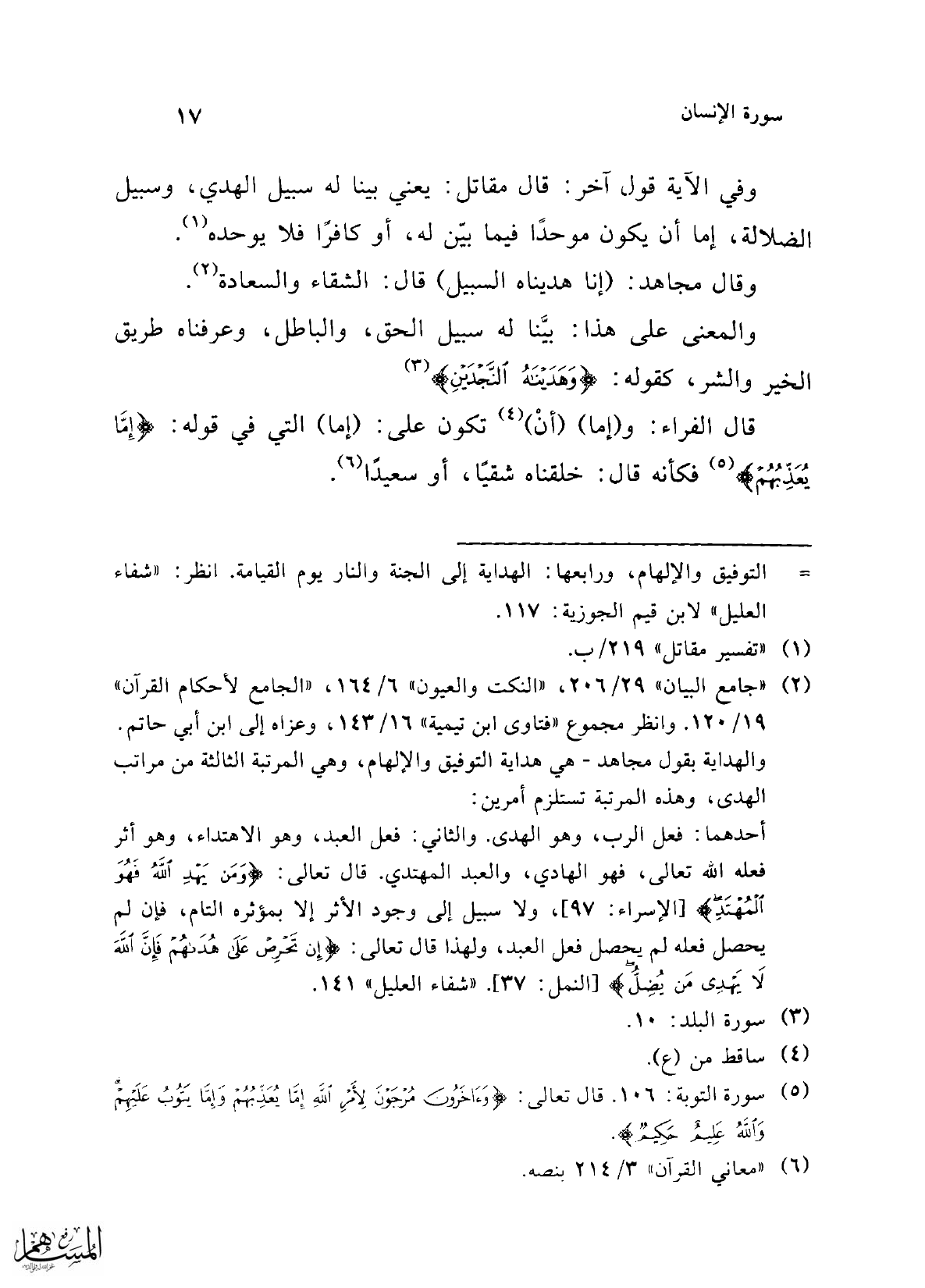 (¬2) "جامع البيان" 29/ 206، "النكت والعيون" 6/ 164، "الجامع لأحكام القرآن" 19/ 120. وانظر مجموع "فتاوى ابن تيمية" 16/ 143، وعزاه إلى ابن أبي حاتم. والهداية بقول مجاهد -هي هداية التوفيق والإلهام، وهي المرتبة الثالثة من مراتب الهدى، وهذه المرتبة تستلزم أمرين: