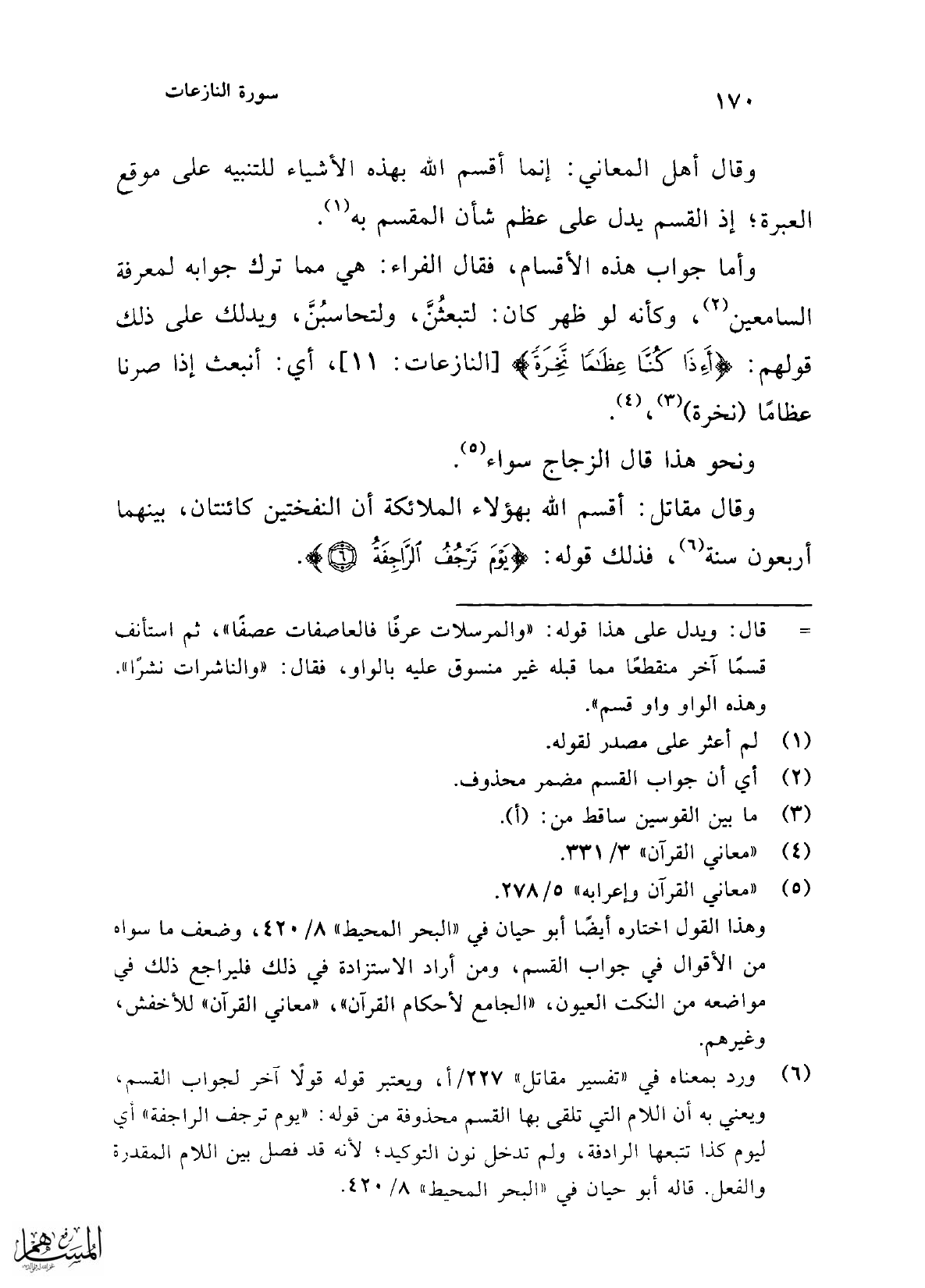 (6) ورد بمعناه في "تفسير مقاتل" 227/ أ، ويعتبر قوله قولًا آخر لجواب القسم، ويعني به أن اللام التي تلقى بها القسم محذوفة من قوله: "يوم ترجف الراجفة" أي ليوم كذا تتبعها الرادفة، ولم تدخل نون التوكيد؛ لأنه قد فصل بين اللام المقدرة والفعل. قاله أبو حيان في "البحر المحيط" 8/ 420.