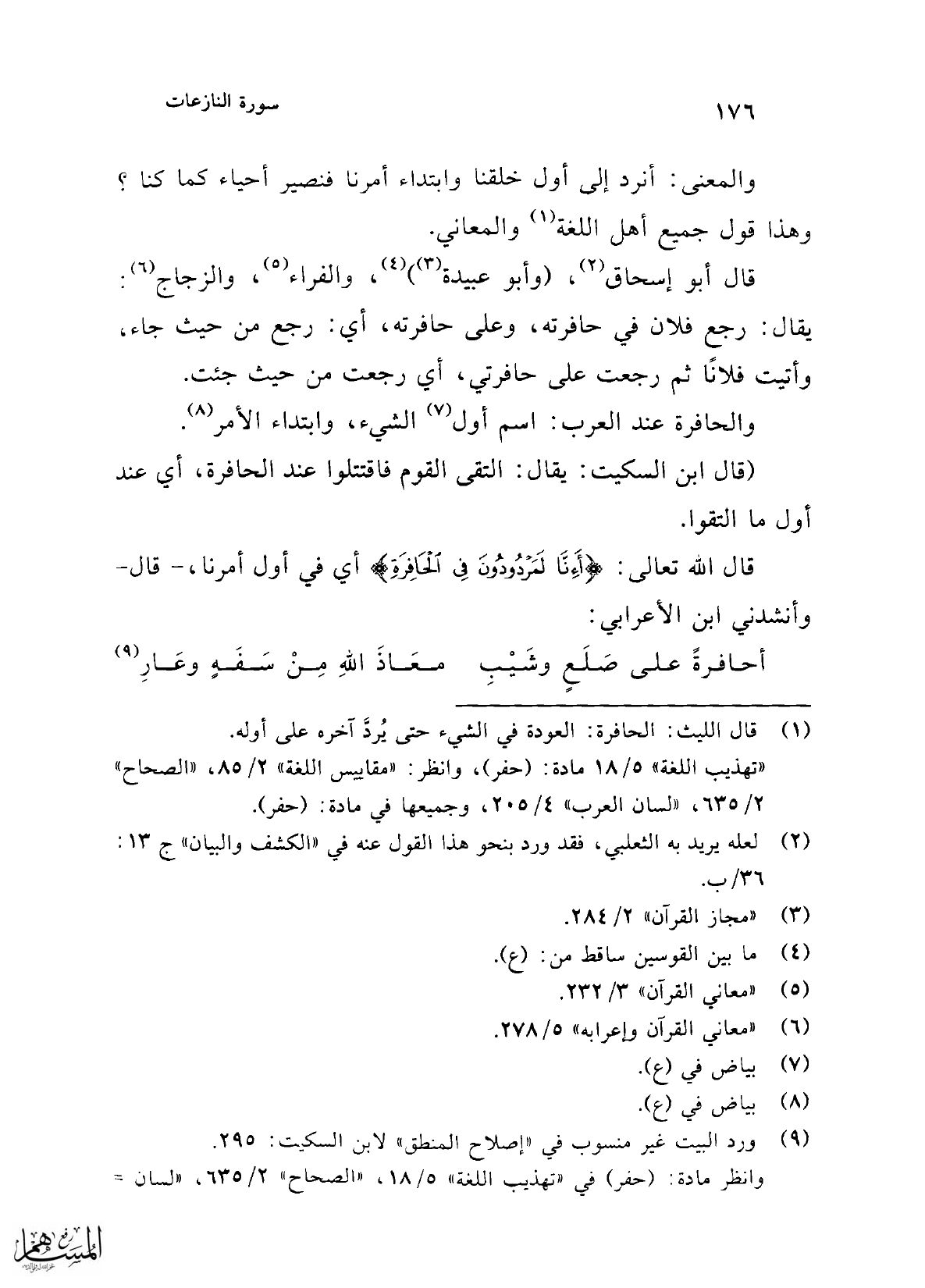 (¬1) قال الليث: الحافرة: العودة في الشيء حتى يُردَّ آخره على أوله.