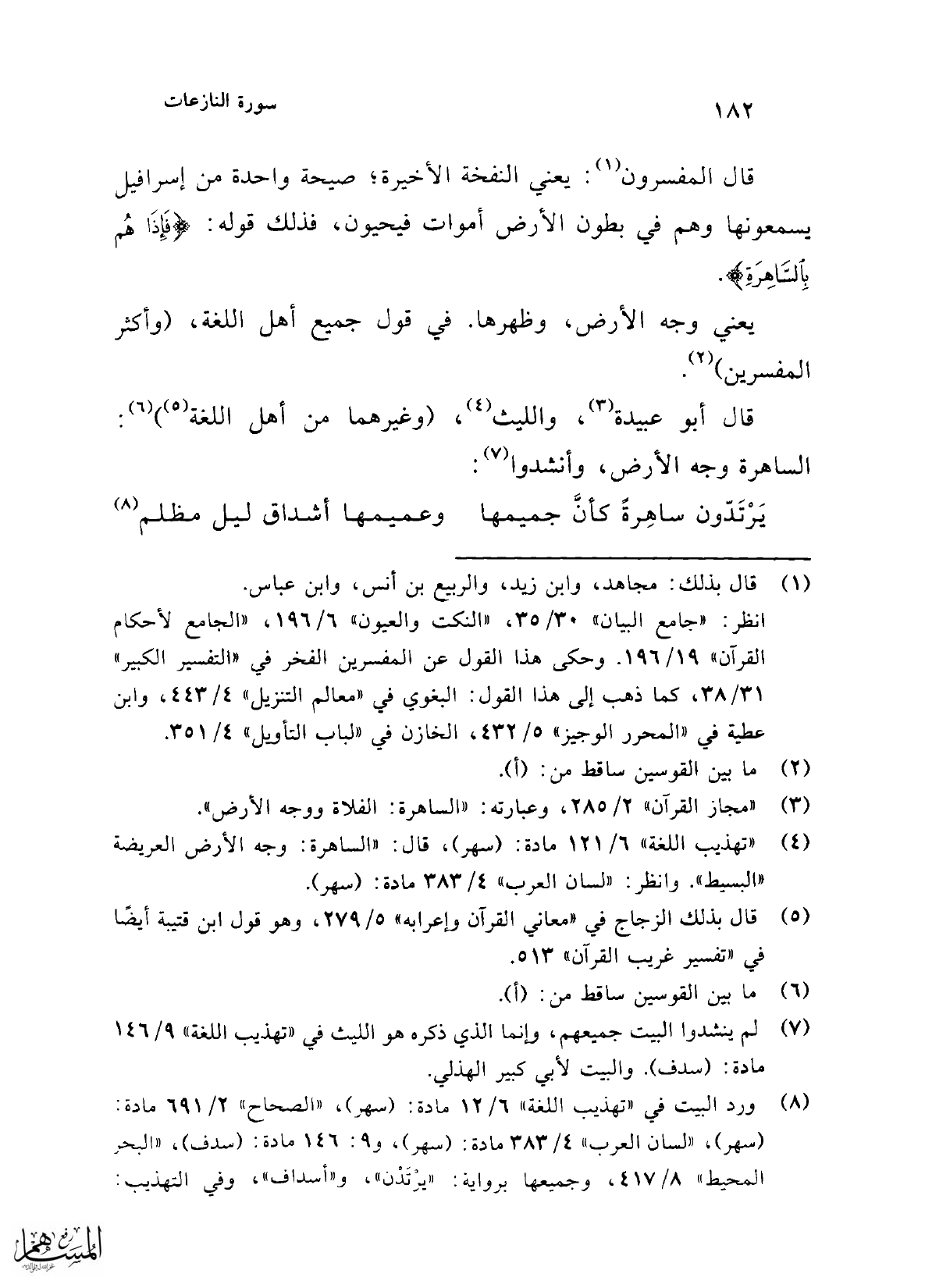 (¬4) "تهذيب اللغة" 6/ 121 مادة: (سهر)، قال: "الساهرة: وجه الأرض العريضة "البسيط". وانظر: "لسان العرب" 4/ 383 مادة: (سهر).