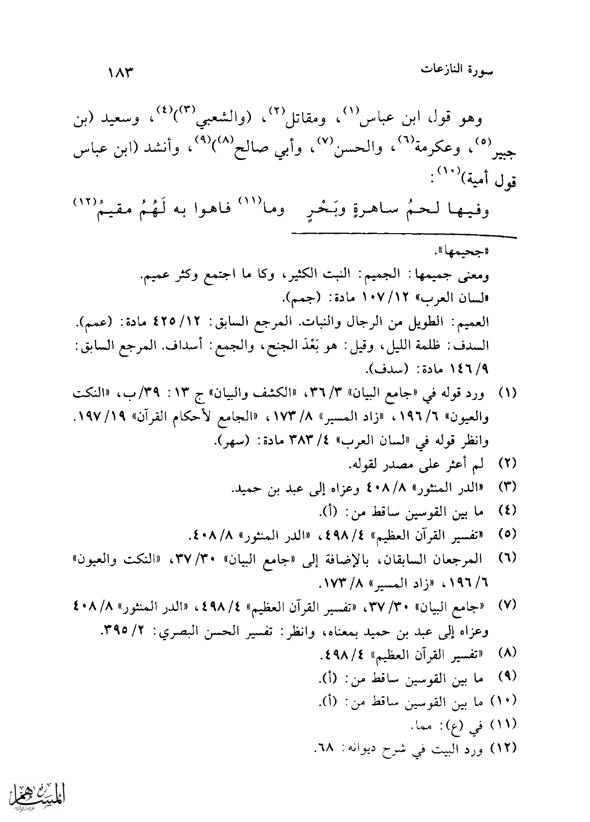 (¬1) ورد قوله في "جامع البيان" 3/ 36، "الكشف والبيان" ج 13: 39/ ب، "النكت والعيون" 6/ 196، "زاد المسير" 8/ 173، "الجامع لأحكام القرآن" 19/ 197. وانظر قوله في "لسان العرب" 4/ 383 مادة: (سهر).