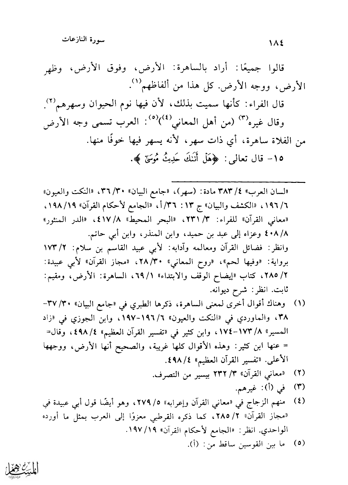 قالوا جميعًا: أراد بالساهرة: الأرض، وفوق الأرض، وظهر الأرض، ووجه الأرض. كل هذا من ألفاظهم (¬1).