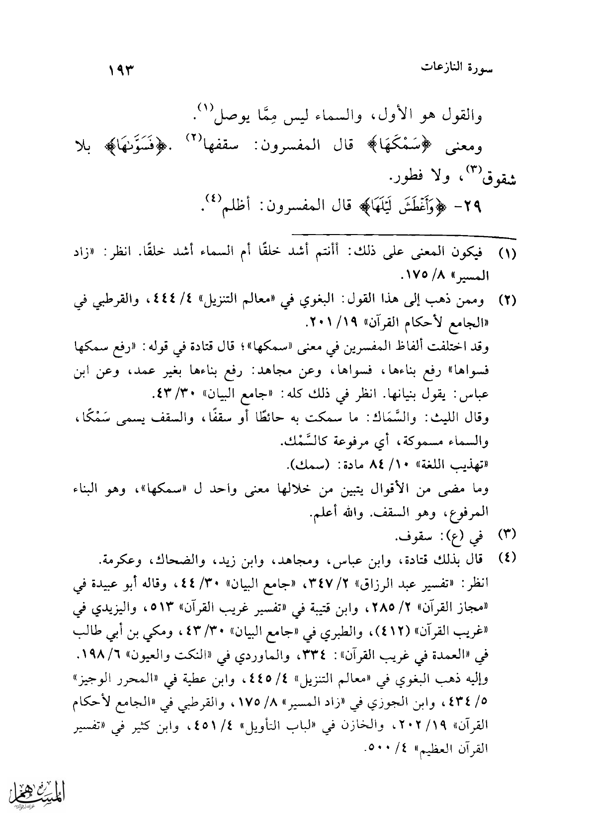 وقد اختلفت ألفاظ المفسرين في معنى "سمكها", قال قتادة في قوله: "رفع سمكها فسواها" رفع بناءها، فسواها، وعن مجاهد: رفع بناءها بغير عمد، وعن ابن عباس: يقول بنيانها. انظر في ذلك كله: "جامع البيان" 30/ 43.