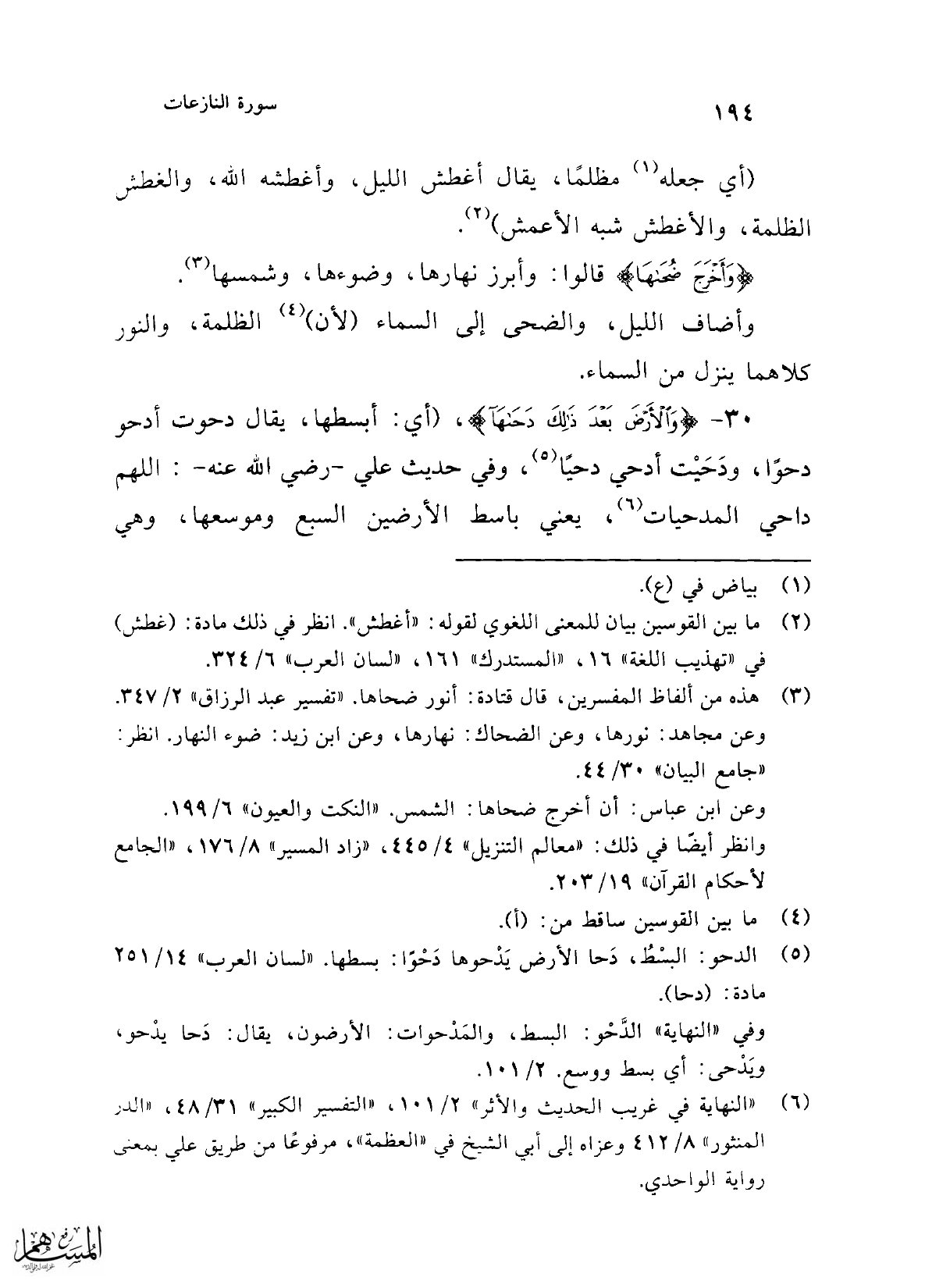 30 - {وَالْأَرْضَ بَعْدَ ذَلِكَ دَحَاهَا}، (أي: أبسطها، يقال دحوت أدحو دحوًا، ودَحَيْت أدحي دحيَّا (¬5)، وفي حديث علي -رضي الله عنه-: اللهم داحي المدحيات (¬6)، يعني باسط الأرضين السبع وموسعها، وهي