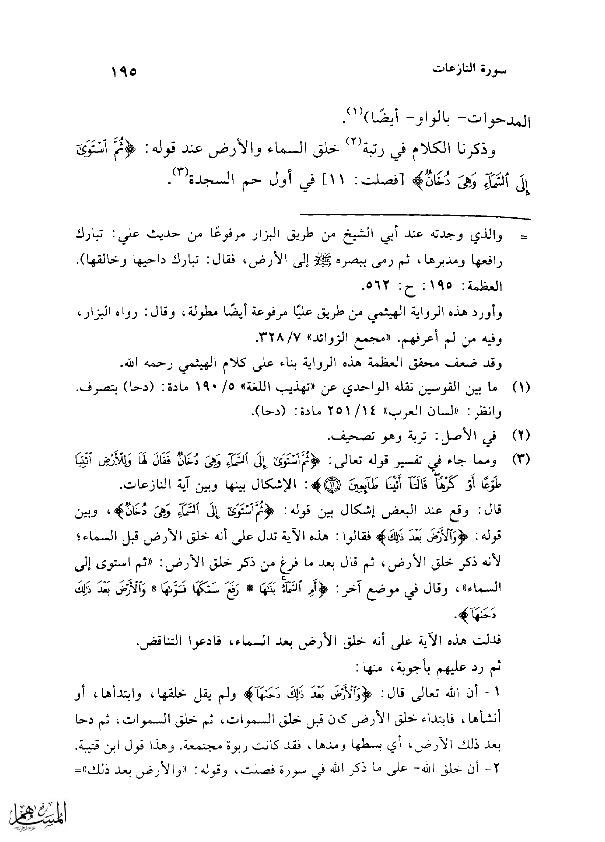 قال: وقع عد البعض إشكال بين قوله: {ثُمَّ اسْتَوَى إِلَى السَّمَاءِ وَهِيَ دُخَانٌ}، وبين قوله: {وَالْأَرْضَ بَعْدَ ذَلِكَ دَحَاهَا} فقالوا: هذه الآية تدل على أنه خلق الأرض قبل السماء؛ لأنه ذكر خلق الأرض، ثم قال بعد ما فرغ من ذكر خلق الأرض: "ثم استوى إلى السماء"، وقال في موضع آخر: {أَمِ السَّمَاءُ بَنَاهَا (27) رَفَعَ سَمْكَهَا فَسَوَّاهَا} {وَالْأَرْضَ بَعْدَ ذَلِكَ دَحَاهَا}