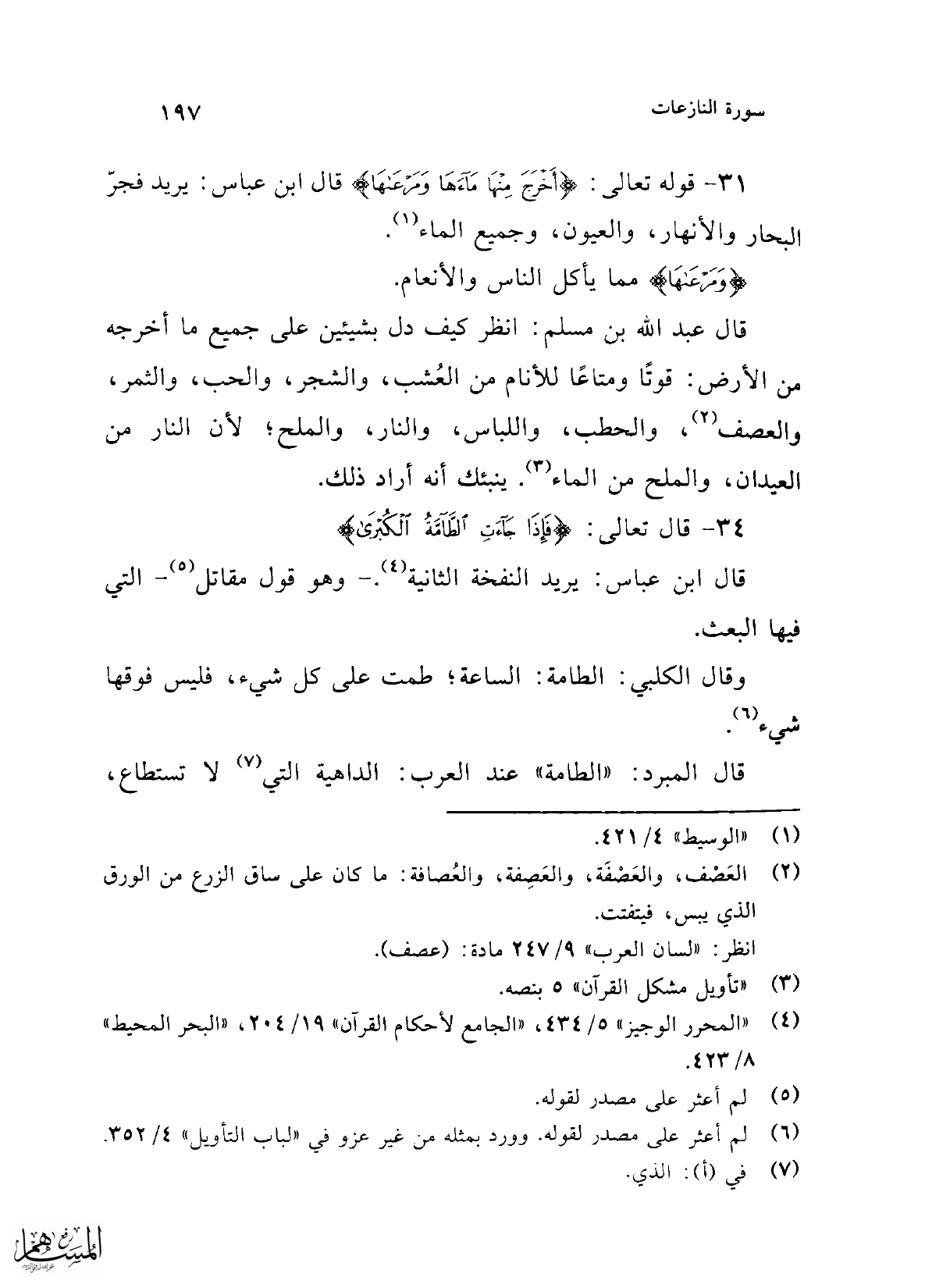 31 - قوله تعالى: {أَخْرَجَ مِنْهَا مَاءَهَا وَمَرْعَاهَا} قال ابن عباس: يريد فجرّ البحار والأنهار، والعيون، وجميع الماء (¬1).