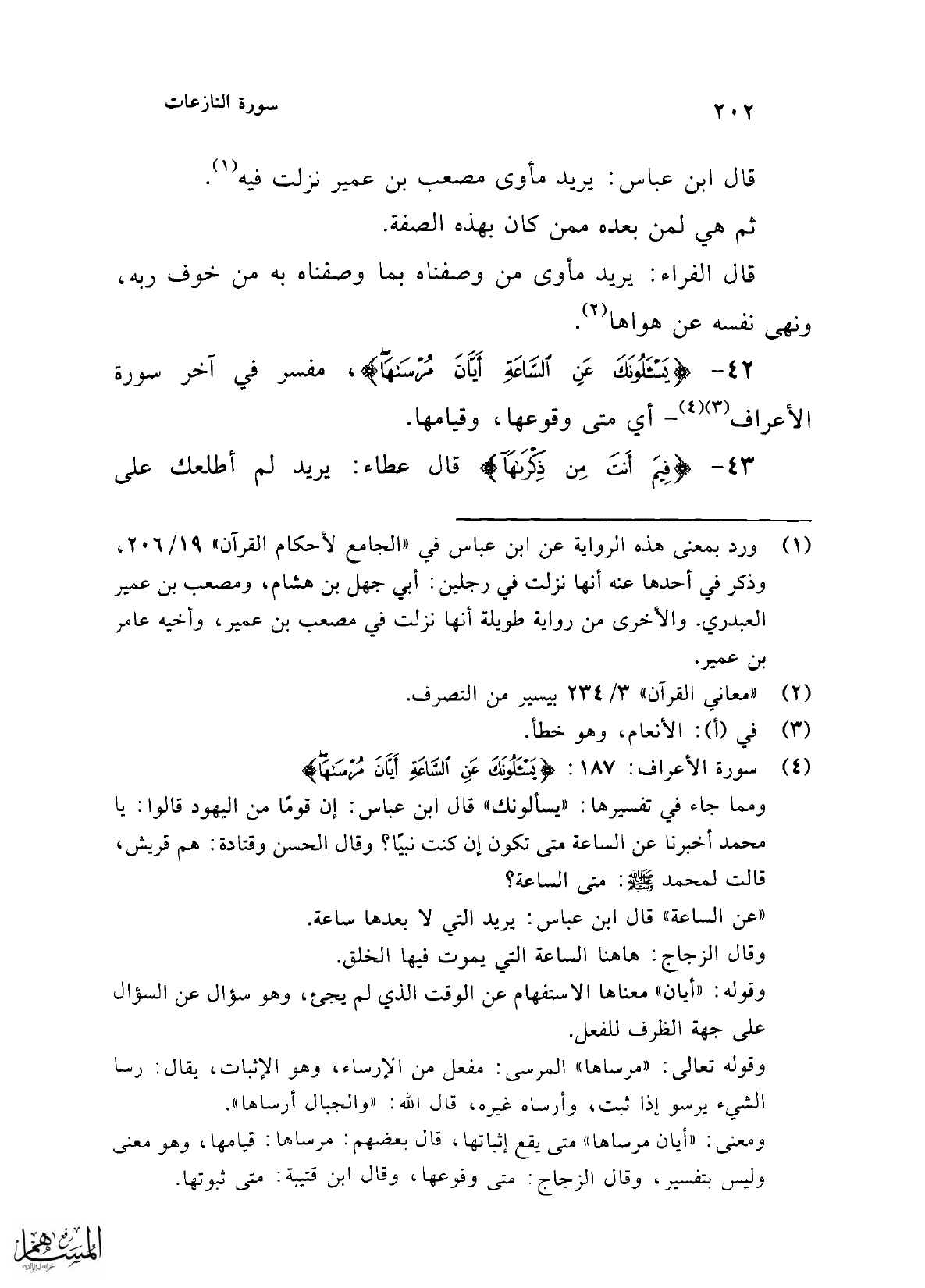 42 - {يَسْأَلُونَكَ عَنِ السَّاعَةِ أَيَّانَ مُرْسَاهَا}، مفسر في آخر سورة الأعراف (¬3) (¬4) -أي متى وقوعها، وقيامها.