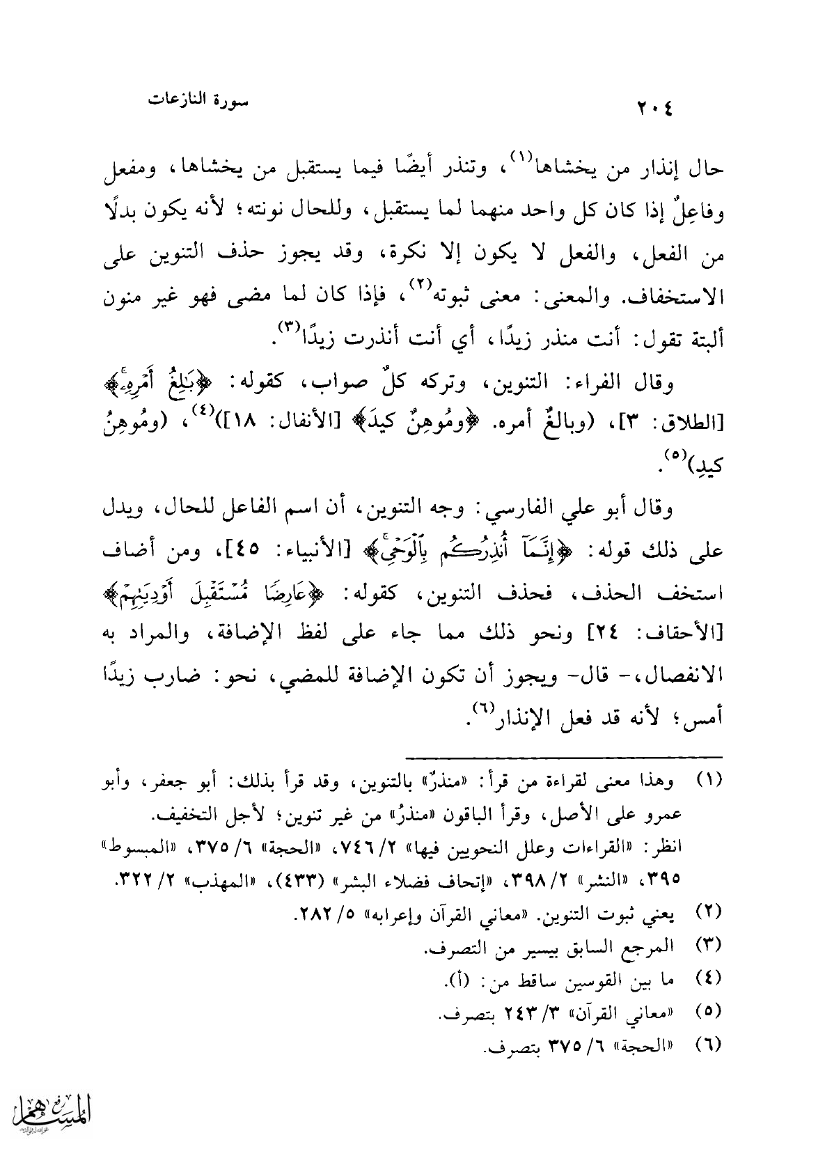 وقال أبو علي الفارسي: وجه التنوين، أن اسم الفاعل للحال، ويدل على ذلك قوله: {قُلْ إِنَّمَا أُنْذِرُكُمْ بِالْوَحْيِ} [الأنبياء: 45]، ومن أضاف استخف الحذف، فحذف التنوين، كقوله: {عَارِضًا مُسْتَقْبِلَ أَوْدِيَتِهِمْ} [الأحقاف: 24]، ونحو ذلك بما جاء على لفظ الإضافة، والمراد به الانفصال، -قال- ويجوز أن تكون الإضافة للمضي، نحو: ضارب زيدًا أمس؛ لأنه قد فعل الإنذار (¬6).