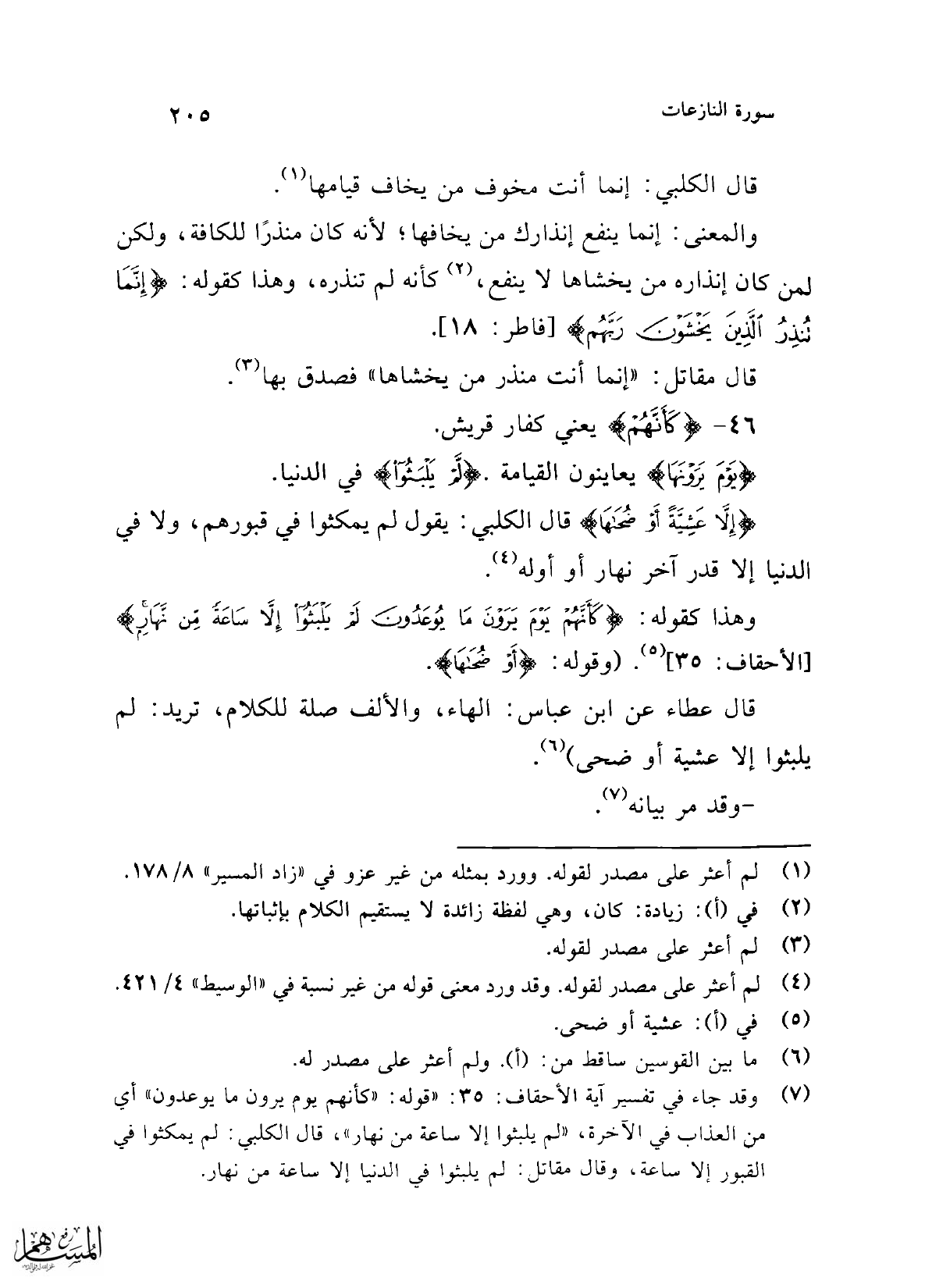 (¬7) وقد جاء في تفسير آية الأحقاف: 35: "قوله: "كأنهم يوم يرون ما يوعدون" أي من العذاب في الآخرة، "لم يلبثوا إلا ساعة من نهار"، قال الكلبي: لم يمكثوا في القبور إلا ساعة، وقال مقاتل: لم يلبثوا في الدنيا إلا ساعة من نهار.
