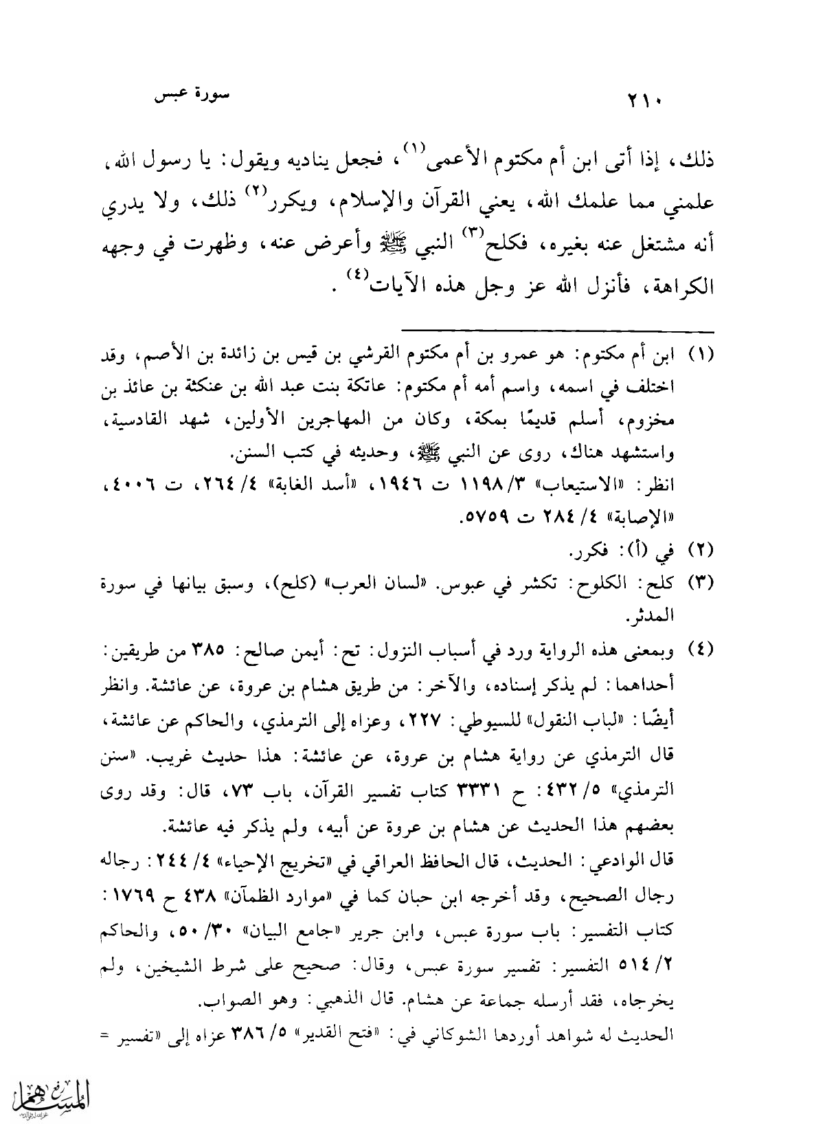 (¬1) ابن أم مكتوم: هو عمرو بن أم مكتوم القرشي بن قيس بن زائدة بن الأصم، وقد اختلف في اسمه، واسم أمه أم مكتوم: عاتكة بنت عبد الله بن عنكثة بن عائذ بن مخزوم، أسلم قديمًا بمكة، وكان من المهاجرين الأولين، شهد القادسية، واستشهد هناك، روى عن النبي -صلى الله عليه وسلم-، وحديثه في كتب السنن.