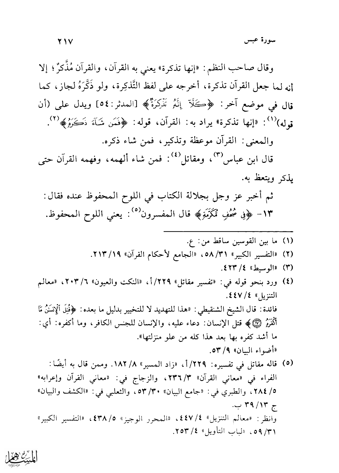 وقال صاحب النظم: "إنها تذكرة" يعني به القرآن، والقرآن مُذَّكرٌ؛ إلا أنه لما جعل القرآن تذكرة، أخرجه على لفظ التَّذكِرة، ولو ذَكَّرَهُ لجاز، كما قال في موضع آخر: {كَلَّا إِنَّهُ تَذْكِرَةٌ} [المدثر:54] ويدل على (أن قوله) (¬1): "إنها تذكرة" يراد به: القرآن، قوله: {فَمَنْ شَاءَ ذَكَرَهُ} (¬2).