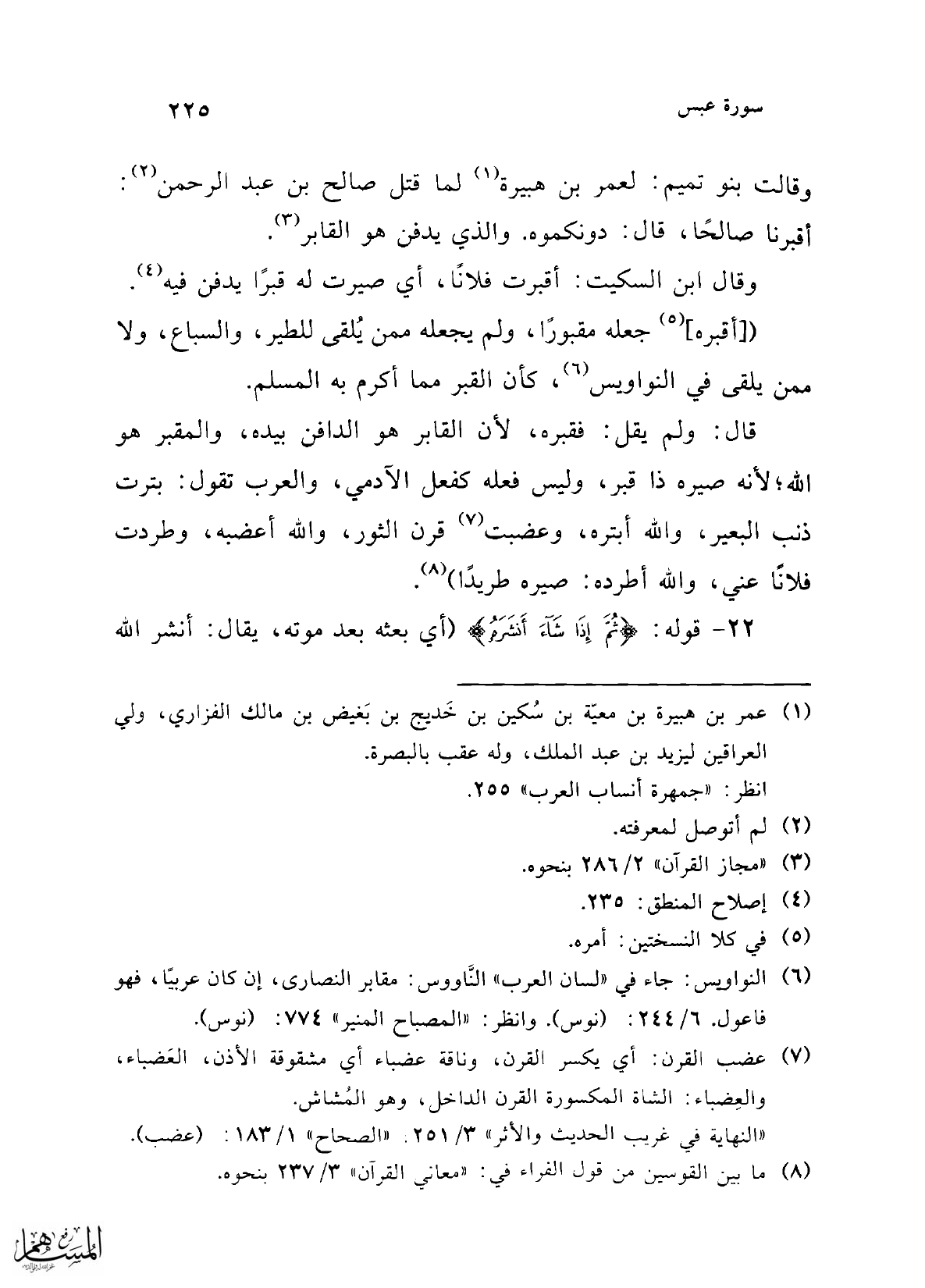 قال: ولم يقل: فقبره, لأن القابر هو الدافن بيده، والمقبر هو الله؛ لأنه صيره ذا قبر، وليس فعله كفعل الآدمي، والعرب تقول: بترت ذنب البعير، والله أبتره، وعضبت (¬7) قرن الثور، والله أعضبه، وطردت فلانًا عني، والله أطرده: صيره طريدًا) (¬8).