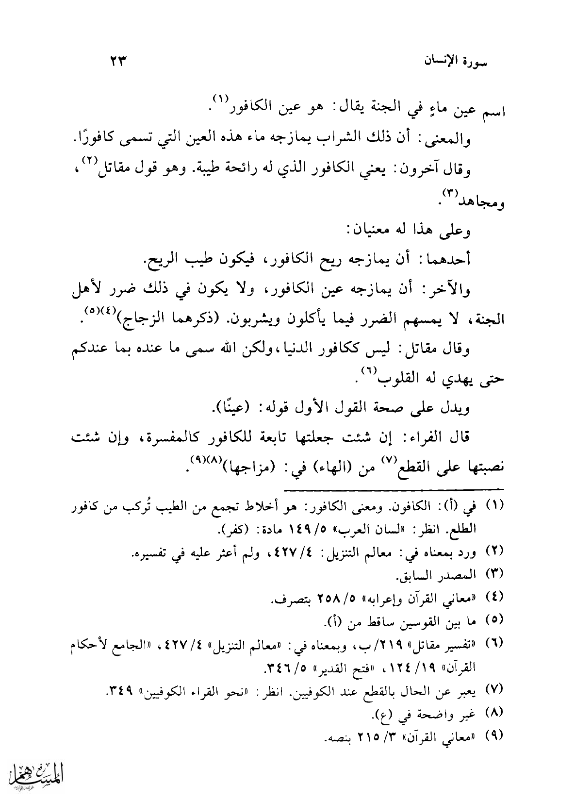 قال الفراء: إن شئت جعلتها متابعة للكافور كالمفسرة، وإن شئت نصبتها على القطع (¬7) من (الهاء) في: (مزاجها) (¬8) (¬9).
