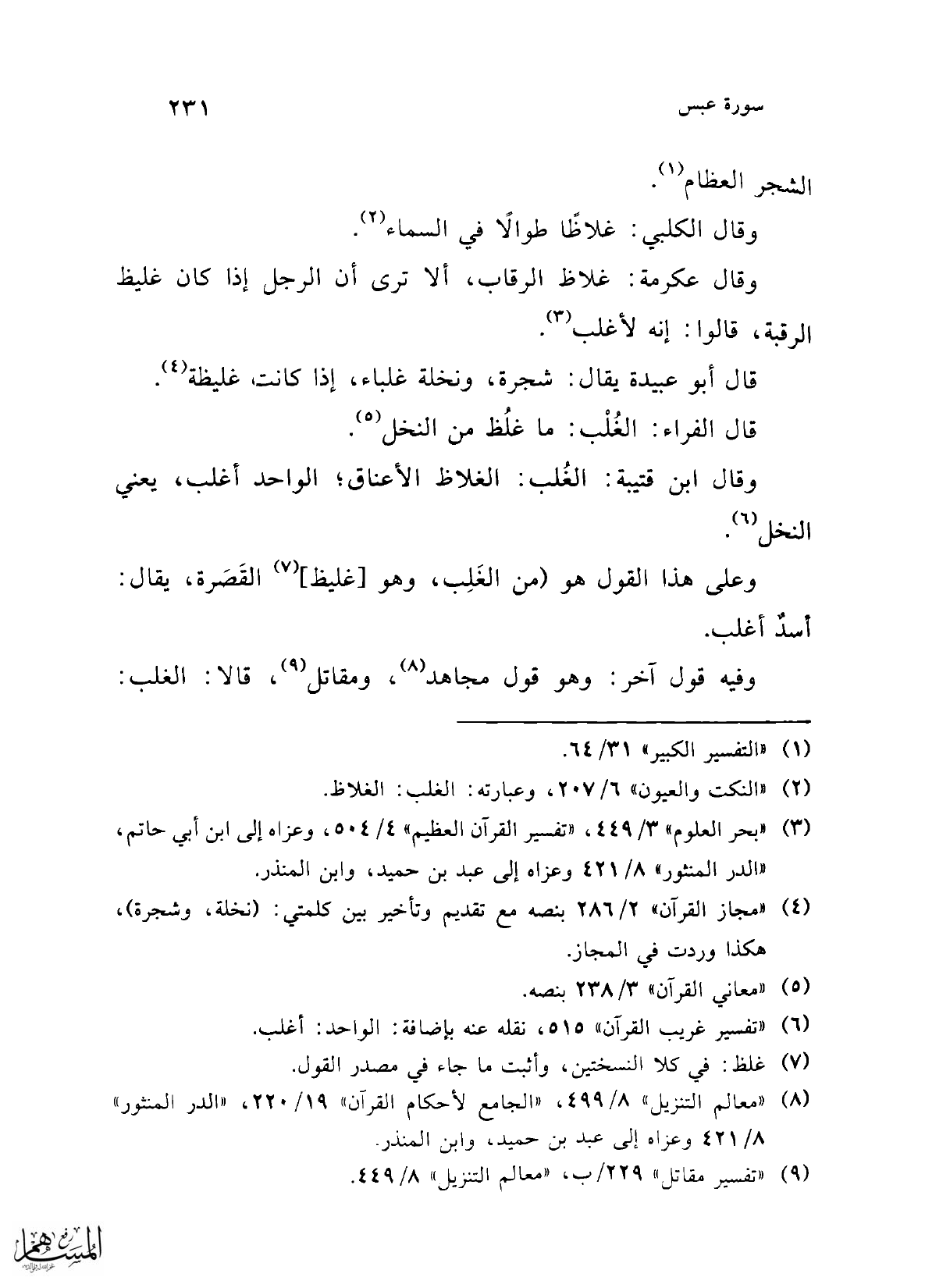 (¬2) "النكت والعيون" 6/ 207، وعبارته: الغلب: الغلاظ.
