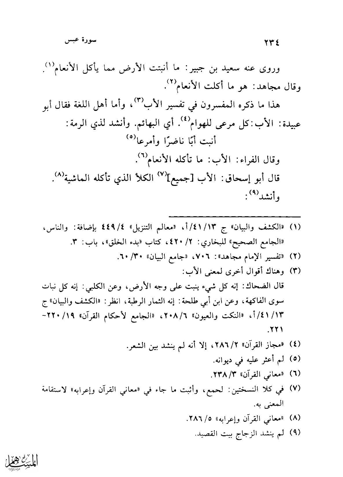 هذا ما ذكره المفسرون في تفسير الأب (¬3)، وأما أهل اللغة فقال أبو عبيدة: الأب: كل مرعى للهوام (¬4). أي البهائم. وأنشد لذي الرمة: