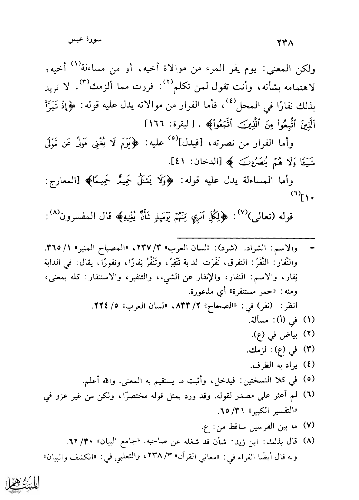 ولكن المعنى: يوم يفر المرء من موالاة أخيه، أو من مساءلة (¬1) أخيه؛ لاهتمامه بشأنه، وأنت تقول لمن تكلم (¬2): فررت مما ألزمك (¬3)، لا تريد بذلك نفارًا في المحل (¬4)، فأما الفرار من موالاته يدل عليه قوله: {إِذْ تَبَرَّأَ الَّذِينَ اتُّبِعُوا مِنَ الَّذِينَ اتَّبَعُوا}. [البقرة: 166]