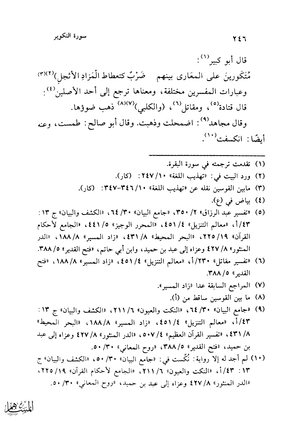 (¬9) "جامع البيان" 30/ 64، "النكت والعيون" 6/ 211، "الكشف والبيان" ج 13: 43/ أ، "معالم التنزيل" 4/ 451، "زاد المسير" 8/ 188، "البحر المحيط" 8/ 431، "تفسير القرآن العظيم" 4/ 507، "الدر المنثور" 8/ 427 وعزاه إلى عبد بن حميد، "فتح القدير" 5/ 388، "روح المعاني" 30/ 50.