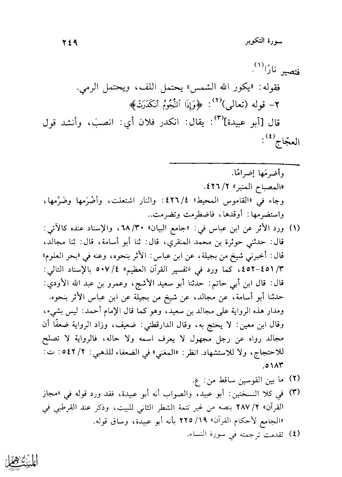 (¬1) ورد الأثر عن ابن عباس في: "جامع البيان" 30/ 68، والإسناد عنده كالآتي: قال: حدثني حوثرة بن محمد المنقري، قال: ثنا أبو أسامة، قال: ثنا مجالد، قال: أخبرني شيخ من بجيلة، عن ابن عباس: الأثر بنحوه، وعنه في "بحر العلوم" 3/ 451 - 452، كما ورد في "تفسير القرآن العظيم" 4/ 507 بالإسناد التالي: قال: قال ابن أبي حاتم: حدثنا أبو سعيد الأشج، وعمرو بن عبد الله الأودي: حدثنا أبو أسامة، عن مجالد، عن شيخ من بجيلة عن ابن عباس الأثر بنحوه. ومدار هذه الرواية على مجالد بن سعيد، وهو كما قال الإمام أحمد: ليس بشيء، وقال ابن معين: لا يحتج به، وقال الدارقطني: ضعيف، وزاد الرواية ضعفًا أن مجالد رواه عن رجل مجهول لا يعرف اسمه ولا حاله، فالرواية لا تصلح للاحتجاج، ولا للاستشهاد. انظر: "المغني" في الضعفاء للذهبي: 2/ 542: ت: 5183.