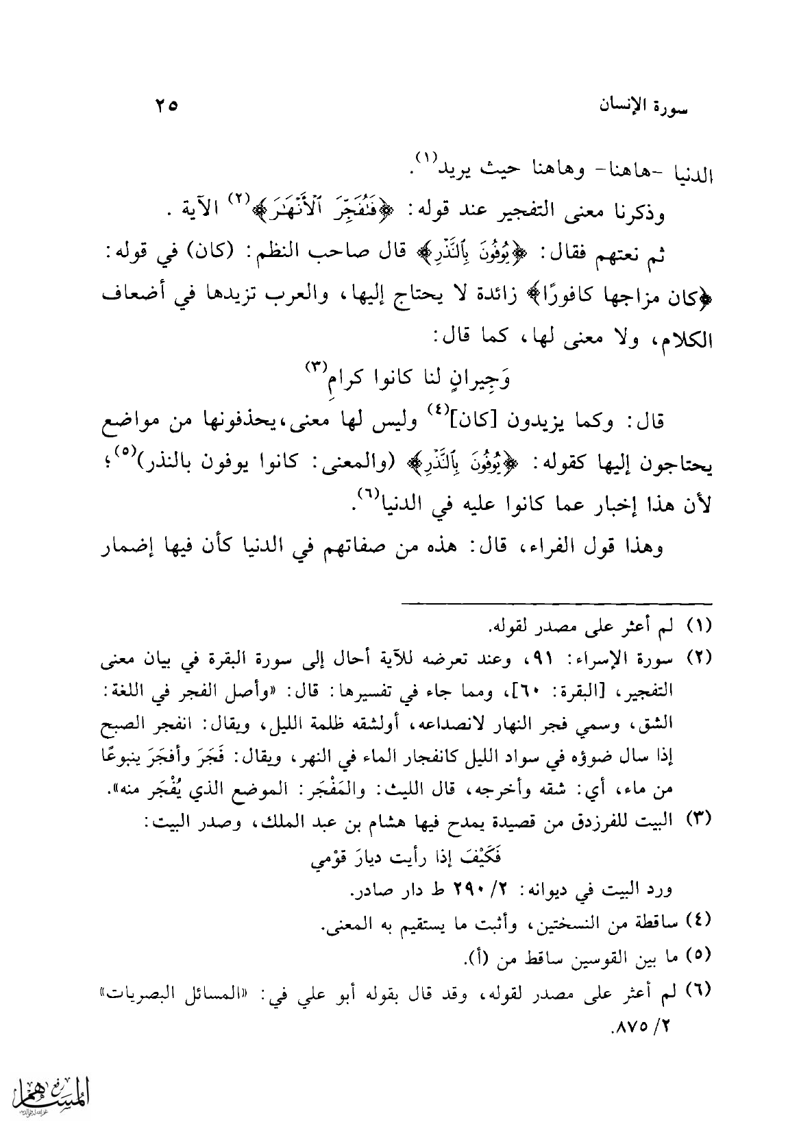 (¬2) سورة الإسراء: 91، وعند تعرضه للآية أحال إلى سورة البقرة في بيان معنى التفجير، [البقرة: 60]، ومما جاء في تفسيرها: قال: "وأصل الفجر في اللغة: الشق، وسمي فجر النهار لانصداعه، أو لشقه ظلمة الليل، ويقال: انفجر الصبح إذا سال ضوؤه في سواد الليل كانفجار الماء في النهر، ويقال: فَجَرَ وأفجَرَ ينبوعًا من ماء، أي: شقه وأخرجه، قال الليث: والمَفْجَر: الموضع الذي يُفْجَر منه".