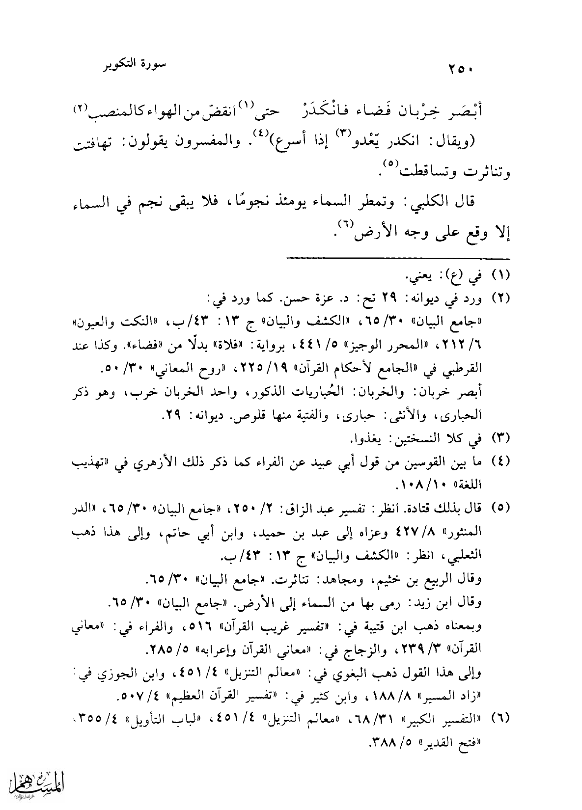 (¬6) "التفسير الكبير" 31/ 68، "معالم التنزيل" 4/ 451، "لباب التأويل" 4/ 355، "فتح القدير" 5/ 388.