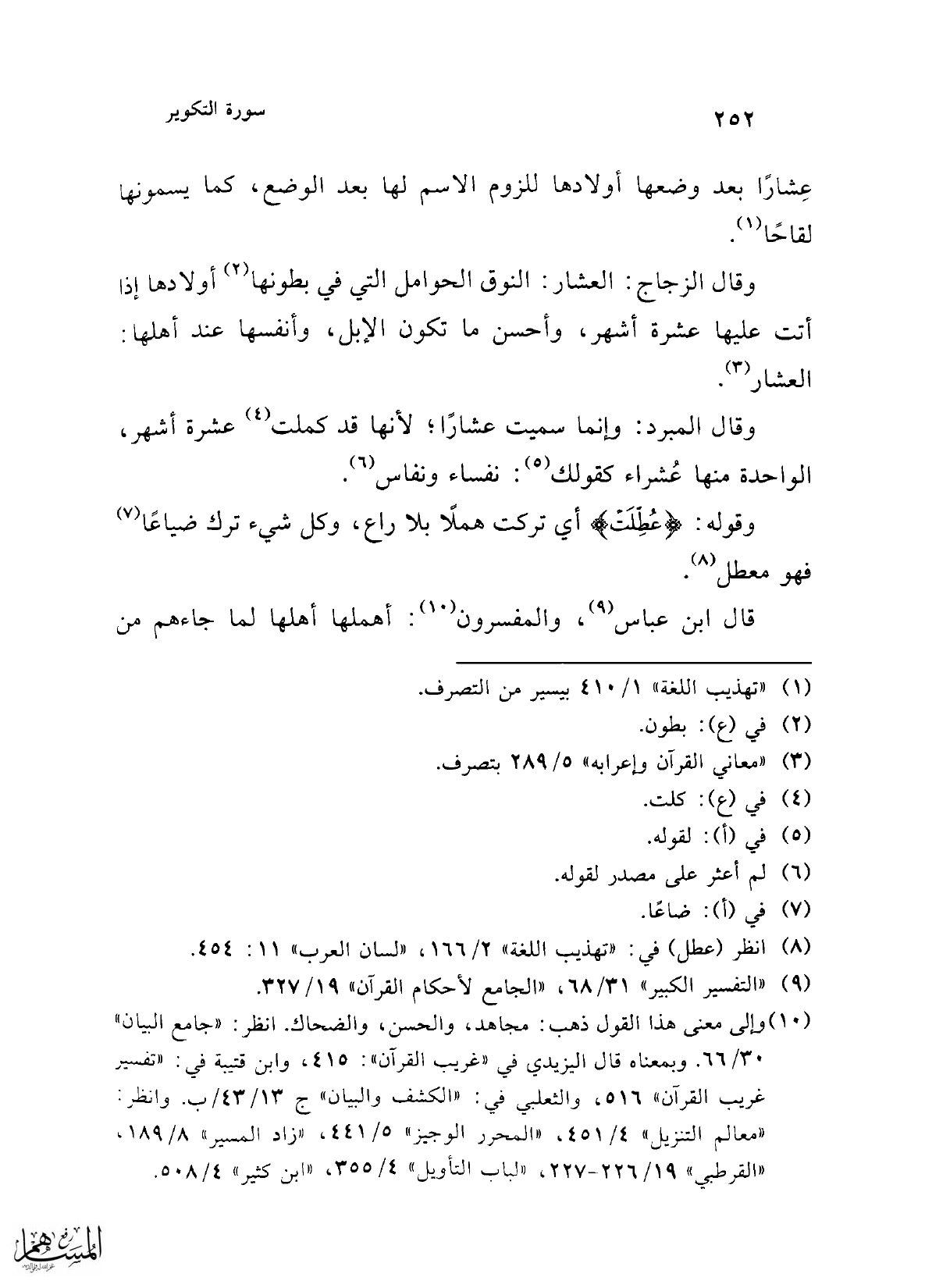 وقال الزجاج: العشار: النوق الحوامل التي في بطونها (¬2) أولادها إذا أتت عليها عشرة أشهر، وأحسن ما تكون الإبل، وأنفسها عند أهلها: العشار (¬3).
