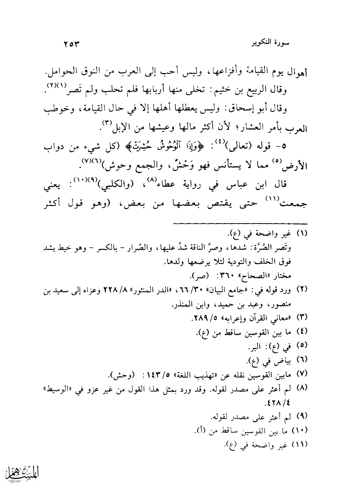 5 - قوله (تعالى) (¬4): {وَإِذَا الْوُحُوشُ حُشِرَتْ} (كل شيء من دواب الأرض (¬5) مما لا يستأنس فهو وَحْشٌ، والجمع وحوش) (¬6) (¬7).