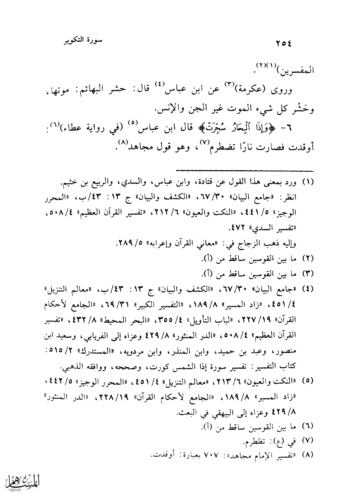 6 - {وَإِذَا الْبِحَارُ سُجِّرَتْ} قال ابن عباس (¬5) (في رواية عطاء) (¬6): أوقدت فصارت نارًا تضطرم (¬7)، وهو قول مجاهد (¬8).