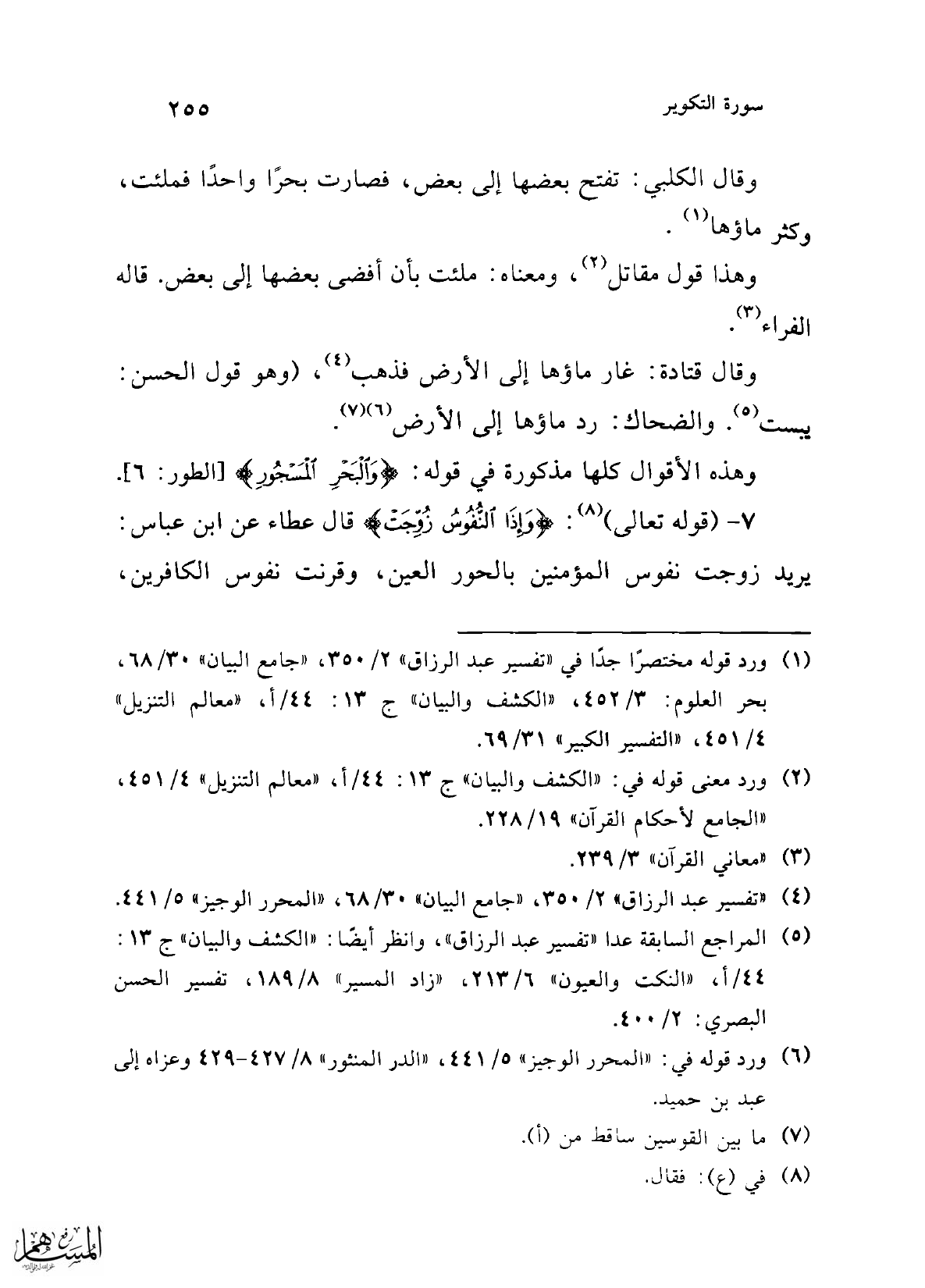 (¬2) ورد معنى قوله في: "الكشف والبيان" ج 13: 44/ أ، "معالم التنزيل" 4/ 451، "الجامع لأحكام القرآن" 19/ 228.