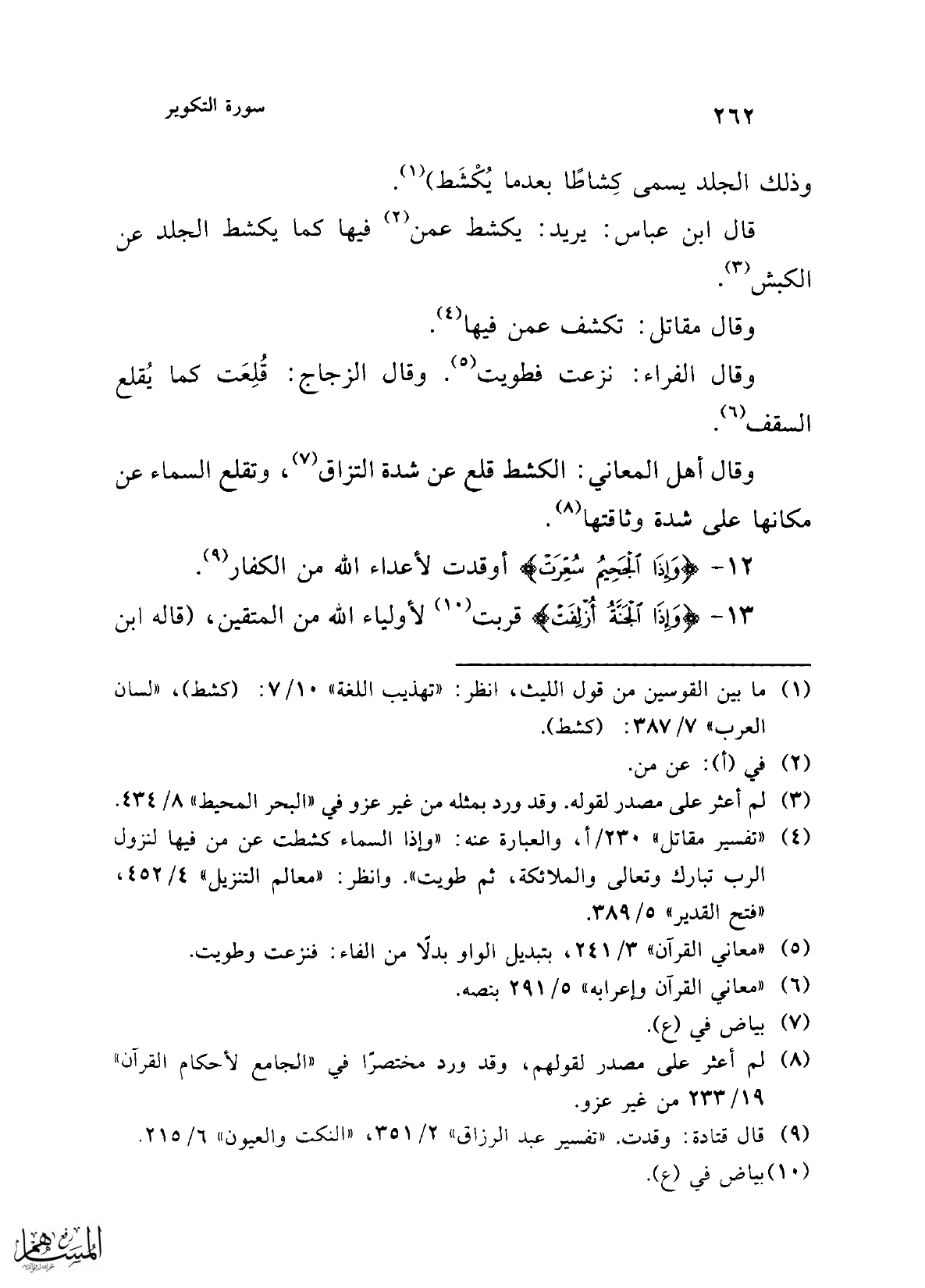 (¬4) "تفسير مقاتل" 230/ أ، والعبارة عنه: "وإذا السماء كشطت عن من فيها لنزول الرب تبارك وتعالى والملائكة، ثم طويت". وانظر: "معالم التنزيل" 4/ 452، "فتح القدير" 5/ 389.
