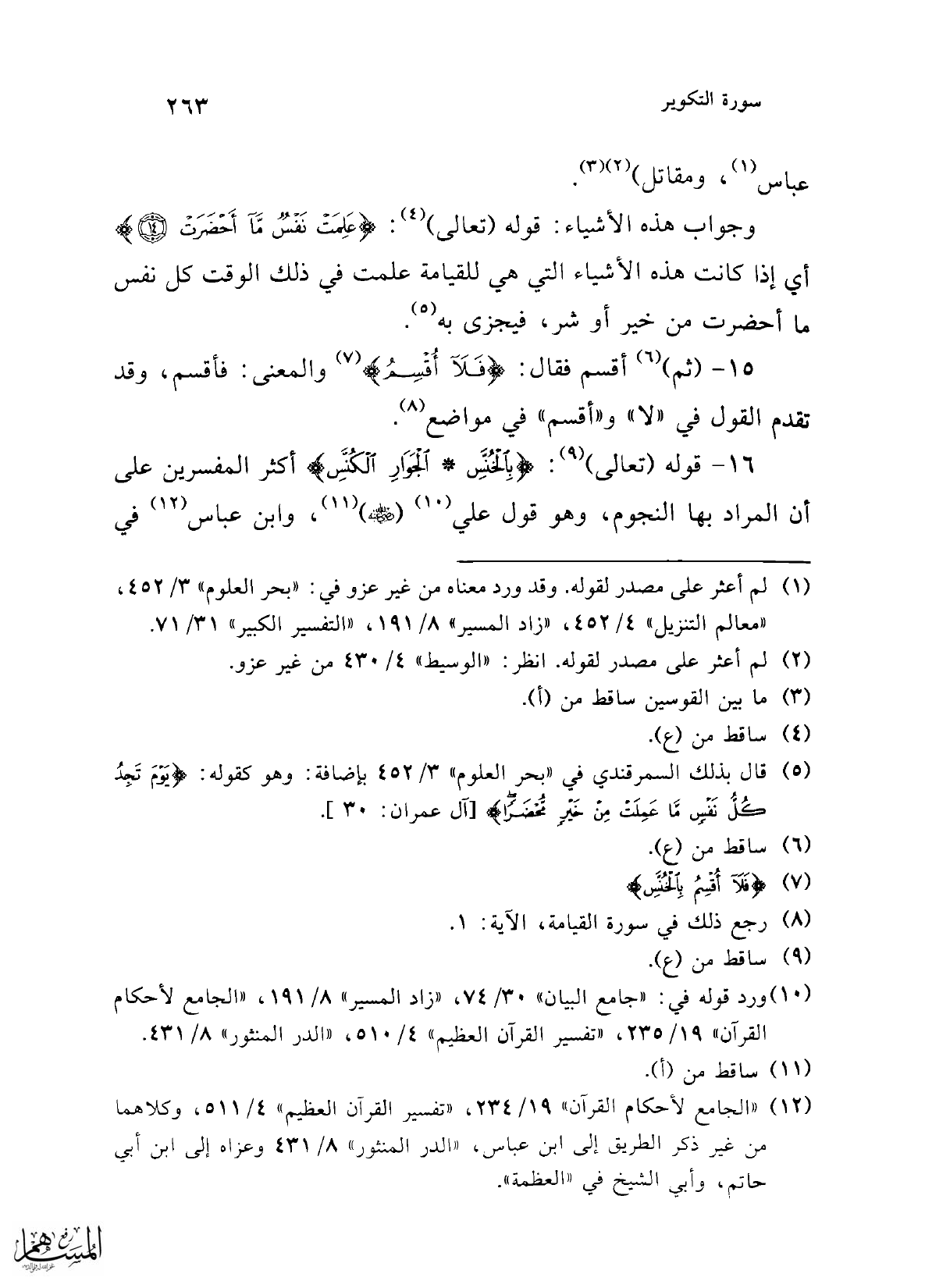 وجواب هذه الأشياء: قوله (تعالى) (¬4): {عَلِمَتْ نَفْسٌ مَا أَحْضَرَتْ (14)} أي إذا كانت هذه الأشياء التي هي للقيامة علمت في ذلك الوقت كل نفس ما أحضرت من خير أو شر، فيجزى به (¬5).