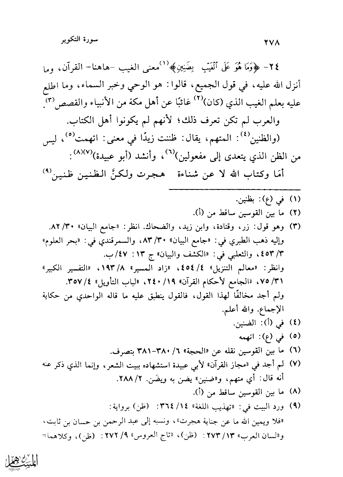 (¬7) لم أجد في "مجاز القرآن" لأبي عبيدة استشهاده ببيت الشعر، وإنما الذي ذكر عنه أنه قال: أي متهم، و"ضنين" يضن به ويضَن. 2/ 288.