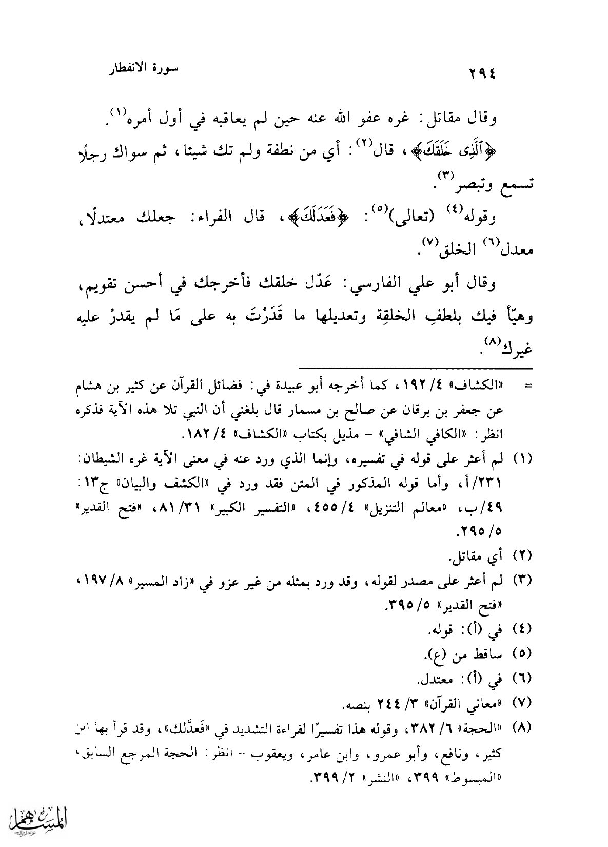 (¬8) "الحجة" 6/ 382، وقوله هذا تفسيرًا لقراءة التشديد في "فَعدَّلك"، وقد قرأ بها ابن كثير، ونافع، وأبو عمرو، وابن عامر، ويعقوب -انظر: الحجة المرجع السابق، "المبسوط" 399، "النشر" 2/ 399.