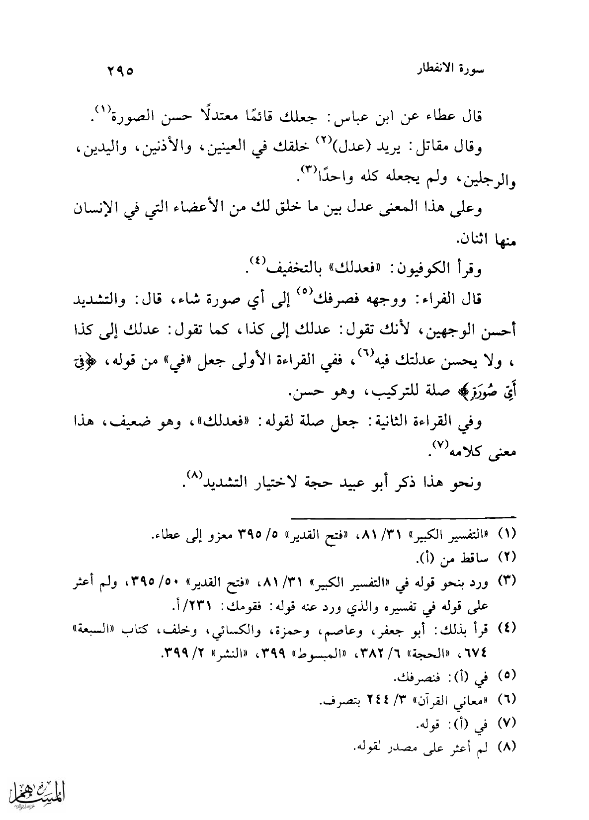 قال الفراء: ووجهه فصرفك (¬5) إلى أي صورة شاء، قال: والتشديد أحسن الوجهين؛ لأنك تقول: عدلك إلى كذا، كما تقول: عدلك إلى كذا، ولا يحسن عدلتك فيه (¬6)، ففي القراءة الأولى جعل "في" من قوله، {فِي أَيِّ صُورَةٍ} صلة للتركيب، وهو حسن.