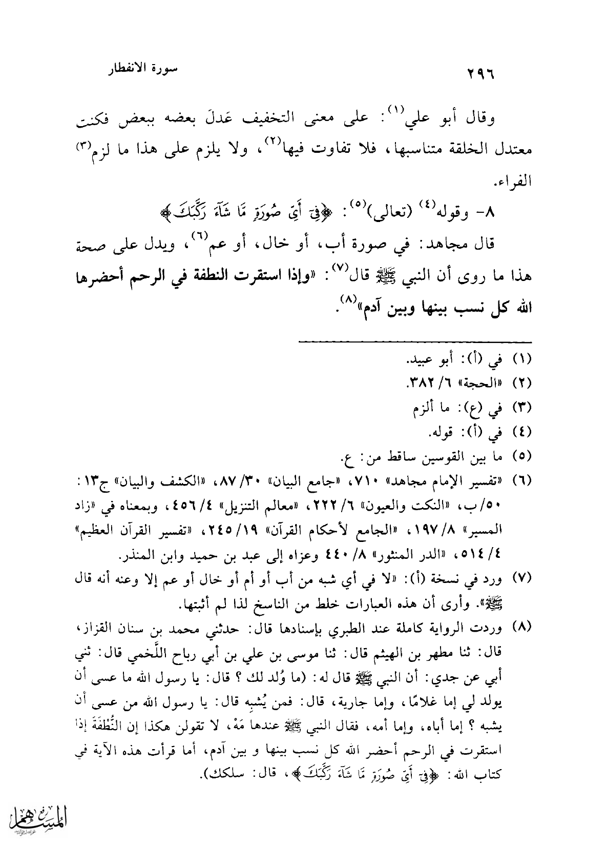 8 - وقوله (¬4) (تعالى) (¬5): {فِي أَيِّ صُورَةٍ مَا شَاءَ رَكَّبَكَ}