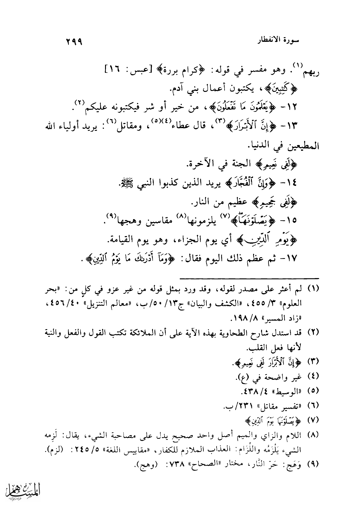 (¬1) لم أعثر على مصدر لقوله، وقد ورد بمثل قوله من غير عزو في كلٍ من: "بحر العلوم" 3/ 455، "الكشف والبيان" ج 13/ 50/ ب، "معالم التنزيل" 40/ 456، "زاد المسير" 8/ 198.